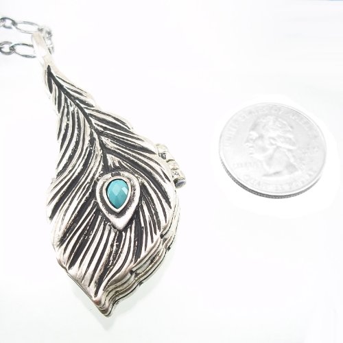 DaisyJewel Urban Bohemian Peacock Feather Locket Pendant Necklace. In Nickel Free/Lead Free Vintage Patina Silvertone Alloy, Necessity and Style Blend to Perfection with a Classic, Versatile Feather Design with Faceted Faux Turquoise Stone Accent. Magnetic-Closure Locket Measures 1 in. Wide by 2.5 in. Long and Hangs from 32.5 in. Adjustable Textured Oval Cable Chain with Lobster Claw Clasp. This Artistic Statement Piece Compliments a Number of Styles, and is Hand Packaged with Care by Amy and Torey in a Complimentary Organza Sachet Gift Bag. All DaisyJewel Items are Sold Only by DaisyJewel. DaisyJewel by Amy and Torey: Blooming Beauty Since 2012!Feature