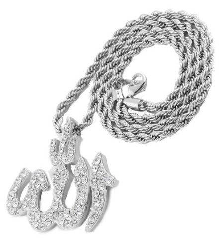 - Title : Silver Iced Out Allah Pendant with a 22 Inch Rope Chain Necklace