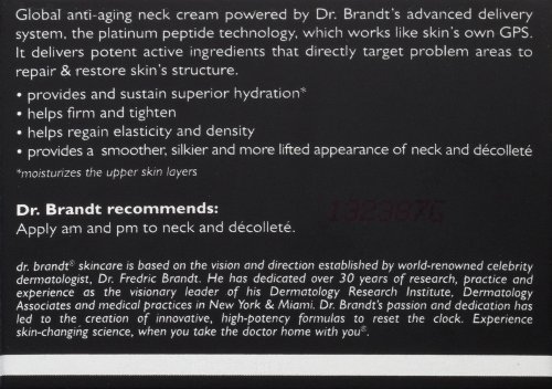 -. Binding : Health and Beauty -. Brand : dr. brandt -. EAN : 0663963004241 -. Feature : dr / brandt do not age firming neck cream is powered by platinum peptide technology which directly targets problem areas to repair & restore skin's structure / This advanced delivery system is like your skins own GPS -. IsAdultProduct : 0 -. Label : Dr. Brandt -. Manufacturer : Dr. Brandt -. Model : 100000000424 -. MPN : CDI-066 -. NumberOfItems : 1 -. PackageQuantity : 1 -. PartNumber : CDI-066 -. ProductGroup : Prestige Beauty -. ProductTypeName : LUXURY_BEAUTY -. Publisher : Dr. Brandt -. ReleaseDate : 2015-02-01 -. Size : 1.7 oz -. Studio : Dr. Brandt -. Title : dr. brandt Do Not Age with dr. brandt Firming Neck Cream, 1.7 fl. oz. -. UPC : 663963004241