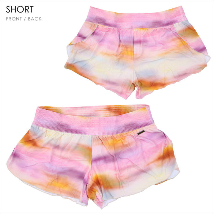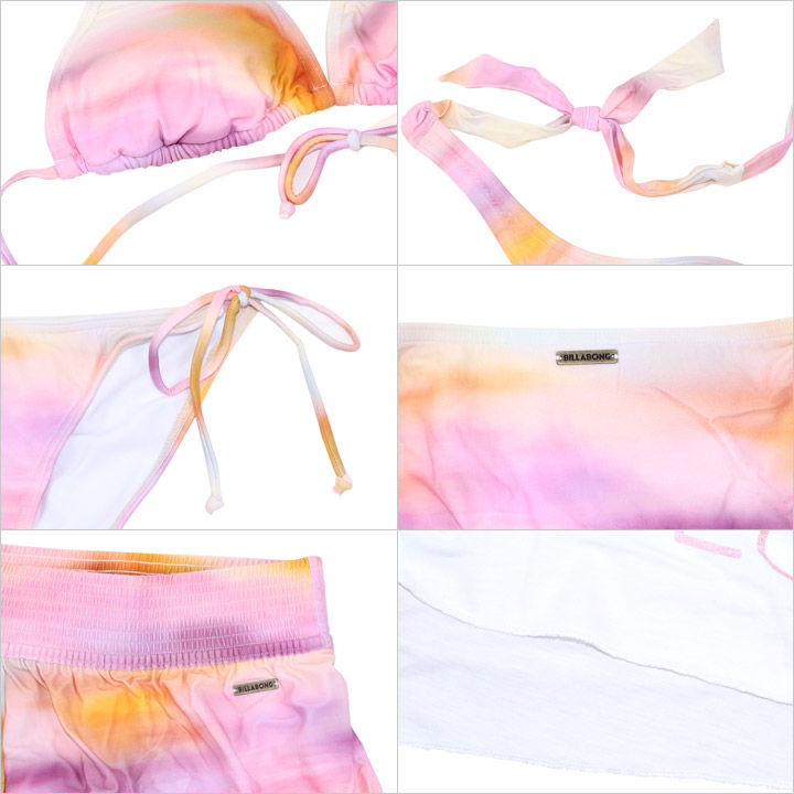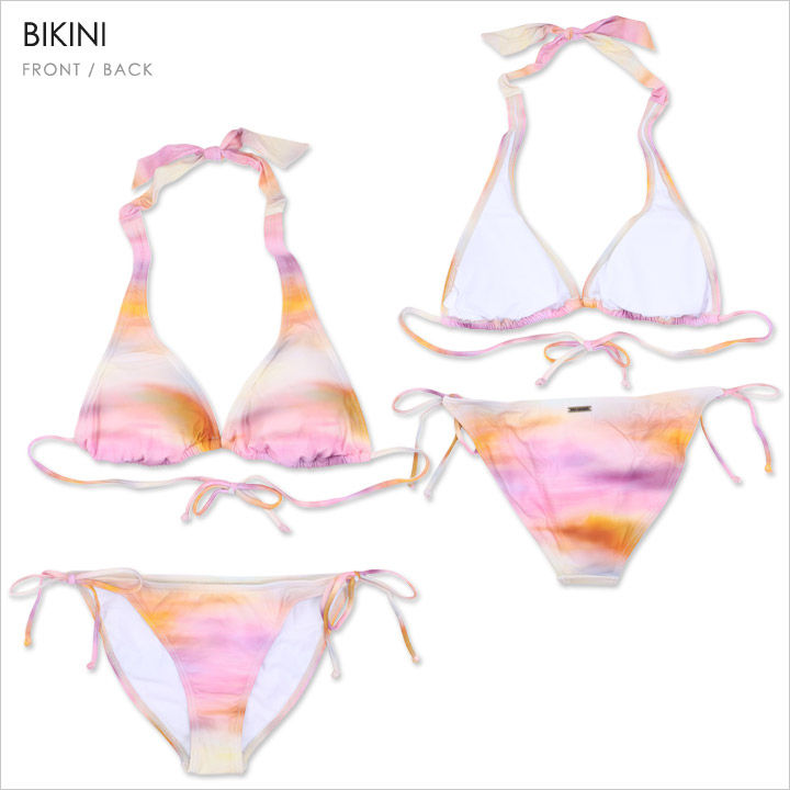 幻想的な淡いグラデーションが大人っぽい印象のホルタービキニに、ラッシュTシャツと水着と同柄のサーフトランクスが付いたお得な3点セット。ホルターのトップはしっかりとバストを包みこみ、どんな胸の大きさにもしっかりフィット。ビキニボトムのサイドリボンはフェイクタイプなので、万が一解けても安心です。