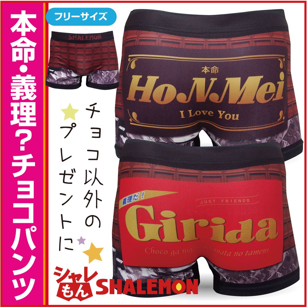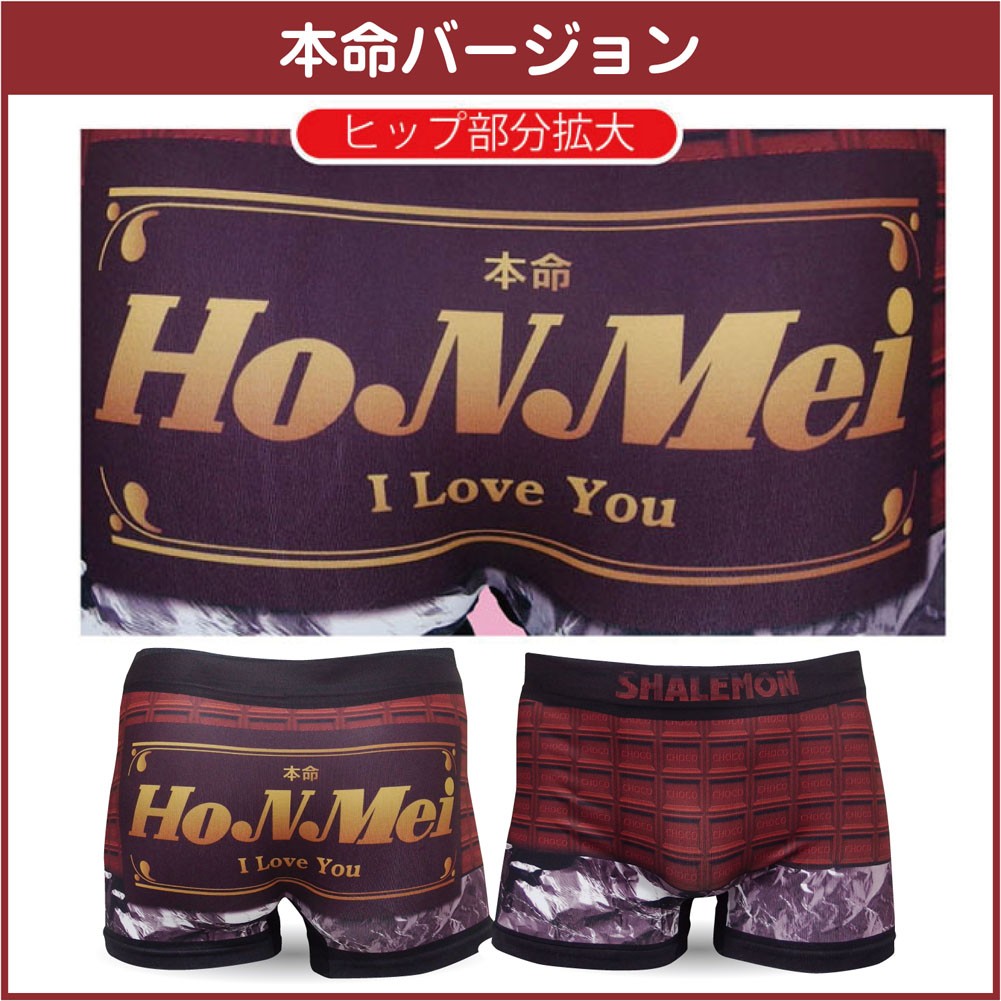 バレンタインのゼントにピッタリな、とってもでオシャレなボクサーパンツ!チョコが苦手な人にもオススメなデザインです。チョコレートモチーフが全面にデザインされた、とってもゴージャスな一枚です。 ヒップ部には本命と義理の2パターンデザインがございますので、お好きなデザイン【本命用・義理用】からお選びください。♪ 柔らかな履き心地が自慢の高伸縮素材のシームレスタイプですので、メンズフリーサイズ(ウエスト74~94cm)なのでサイズの心配も少ないからオススメです。通常はチョコデザインのボックスパッケージとなりますが、メール便を選択された場合、厚さを2cm以内にするため袋パッケージに変更します。