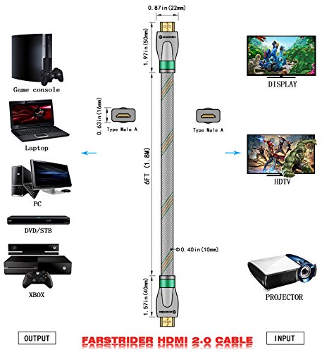 FARSTRIDER HDMI cable 2.0 Version Super High Quality with 3D Technology and Audio return(ARC)/CAT-2 HDMI Cable(Full 1080p/2160p approved),Full Ultra HD 4k support - 2160p (4096 X 2160 pixels),extended colour spaces such as xv Colour and Deep Colour.Supports 720p, 1080i,1080p and 2160p also Supports 4K x 2K Video and more color spare,Supports 54-Bit Deep Color for a Crispy Image.Supports True HD Dolby 7.1 and DTS-HD Master Audio,Support for all television with 1000Hz rates and above.