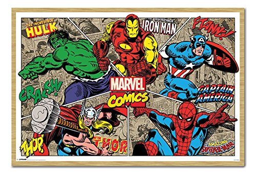 -. Title : Marvel Comics Character Burst Poster Magnetic Notice Board Beech Framed - 96.5 x 66 cms (Approx 38 x 26 inches)