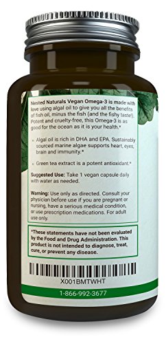 SUSTAINABLY SOURCED ALGAL OIL: Nested Naturals Vegan Omega-3 is proudly made from vegan algal oil. Fish get their DHA and EPA by eating tiny plants floating around in the ocean - marine algae - making fish a sort of Omega-3 middleman. Why not go directly to the plant source? Our marine algae is grown sustainably on a farm, not harvested from the ocean, which allows us to tightly control the purity and quality. It's a win-win. You get a boost of pure Omega-3 fatty acids and the fish swim free.