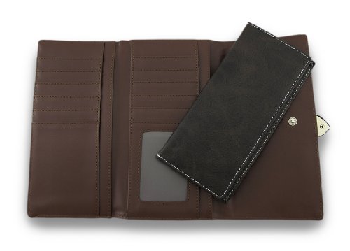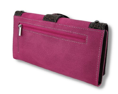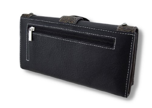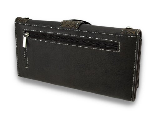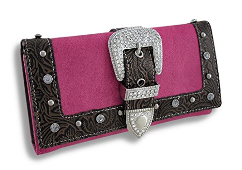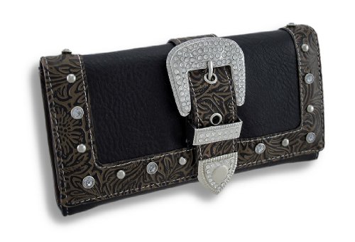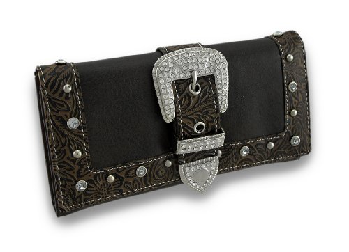 Studio : Zeckos Publisher : Zeckos Product Description This Western style trifold wallet features textured brown trim accented by rhinestones, chrome plated studs, and a dazzling rhinestone buckle in the center of it. Made of vinyl, it measures 7 1/2 inches long and 4 inches high. The interior contains a total of 11 card slots, a window view I.D. slot, 4 slip pockets for cash and receipts, and a removable checkbook holder. There is also a zippered compartment on the back of the wallet for coins, and the wallet has a snap closure. 0