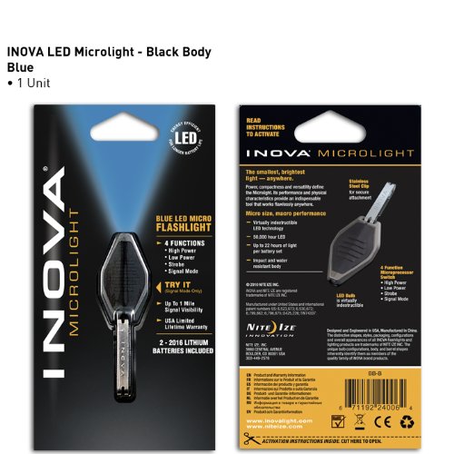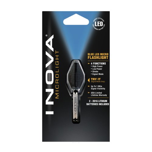 Amazon.com Product Description For a tiny-but-bright light anytime, anywhere, try the Microlight from Inova. Get micro size and macro performance, with true power, compactness, flexibility, and a cobalt blue LED beam. This is the only LED flashlight to bring INOVA engineering, technology and performance to its size class. Unlike other lights, the Microlight projects a highly focused light beam up to 33 feet with up to one-mile signal visibility, and it offers up to 15 hours of burn time per battery set. Also, the Microlight is built to last. With a rugged polycarbonate body, recessed lamp, internal stainless steel switch and momentary-on, plus constant on/off functionality--the Microlight's go-anywhere practicality is unbeatable. This small but mighty flashlight is crafted with quality components and designed for versatility. Its rugged construction, light performance, dual operating modes and portable, compact size provide owners with a flashlight that is ready to go virtually anywhere to light the situation at hand again and again and again.