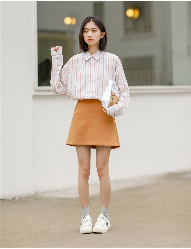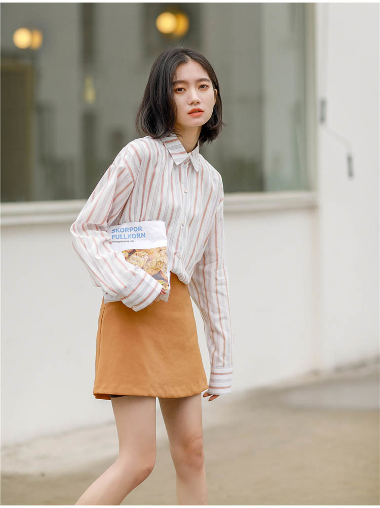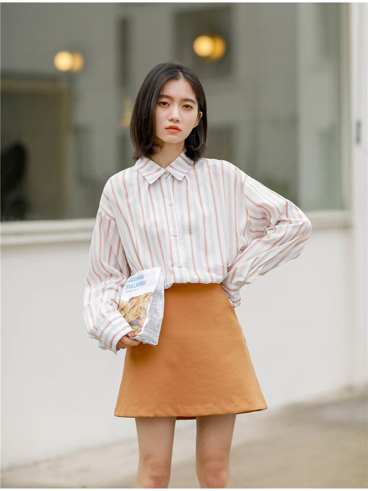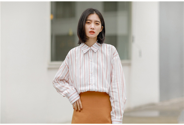落ち着いた色使いが大人っぽい雰囲気の、長袖ストライプシャツです。