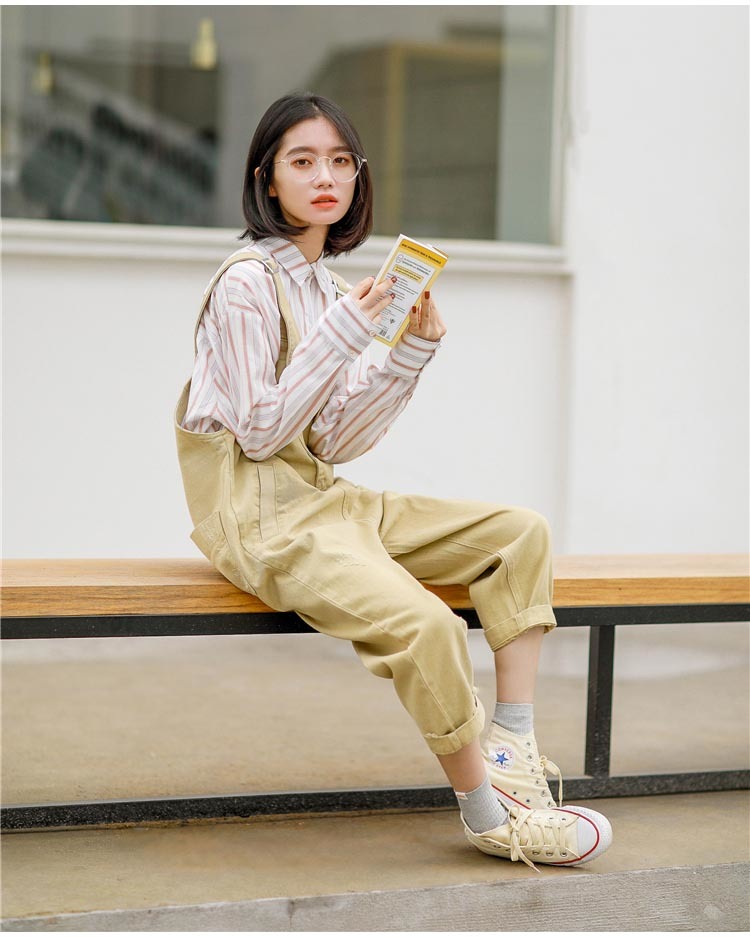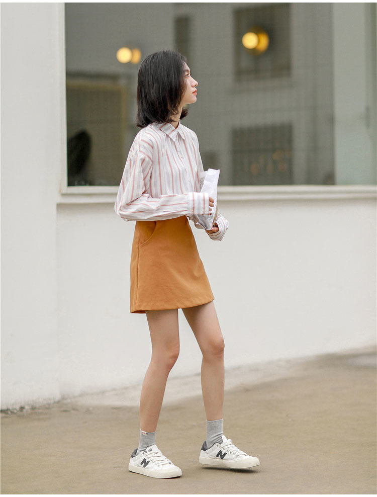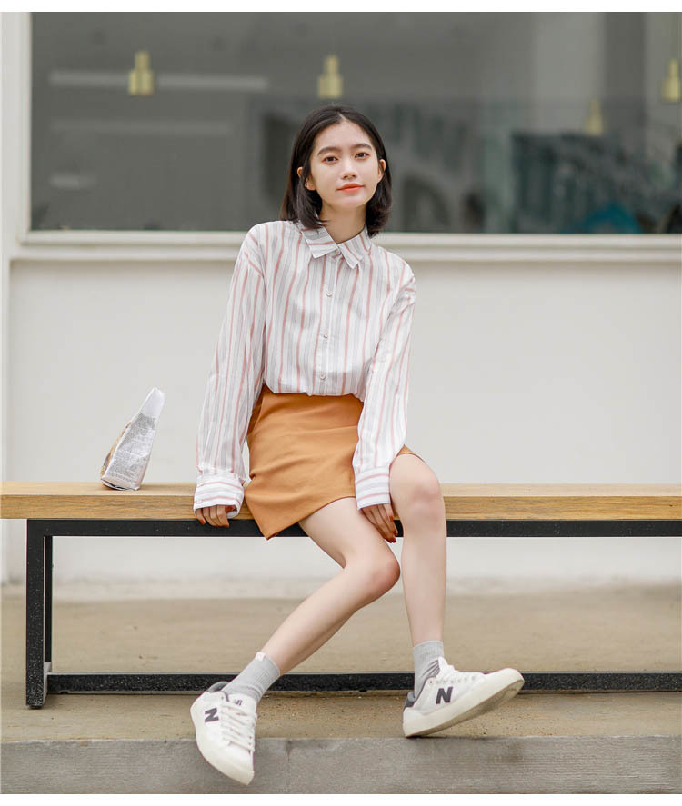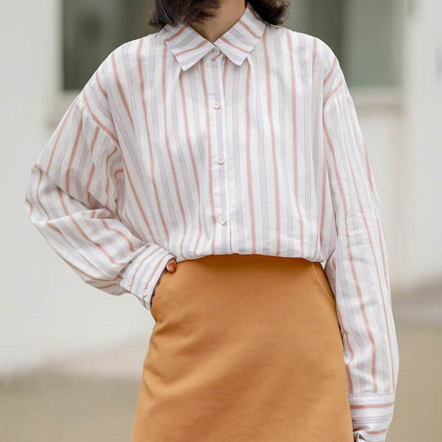 細めのストライプと程よいゆったり感で、体型カバーしながらもすらっと印象に仕上げてくれます。