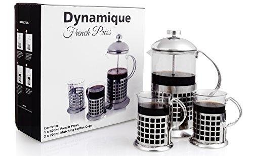 -. Feature : COFFEE AT ITS BEST with Dynamique French Press. It extracts the coffee beans' flavor and essential oils to brew a bold, full-bodied cup of coffee every time. The press filter captures all the course grounds to ensure the smooth taste for total enjoyment. Definitely a coffee maker for purists. / STYLISH DESIGN. The glass carafe is held by a gleaming stainless steel frame with a curved handle, polished to a mirror finish. Comes with 2 matching coffee cups for you and your guest. Perfect for an afternoon soiree. / SUPERB QUALITY. The glass carafe is made of borosilicate glass that can resist up to 180 degrees C(356 degrees F) temperature. The glass has a thickness of 1.5mm and is highly durable while the metal handle stays cool at all times. Both the coffee pot and cups are dishwasher safe, making upkeep very easy. / THE PERFECT GIFT for weddings, housewarmings, holidays and birthdays. You have two attractive, ultra-modern designs to choose from. Something your coffee connoisseur friends can totally appreciate. / COMES with our FREE "Dynamique Coffee Timer" app (iOS and Android) with instructions and timers on how to brew the perfect pot of coffee.