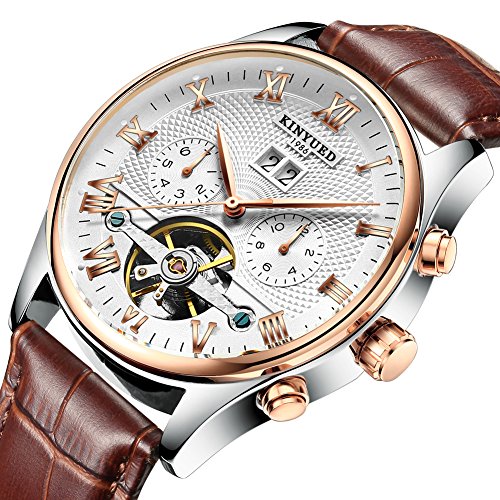 -. Title : KINYUED Men Mechanical Watch Skeleton Tourbillon Automatic Movement Genuine Leather Band Calendar Display