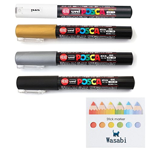 Uni Posca Paint Marker Extra Fine (0.7mm) SPECIAL SET!! - WHITE / GOLD / SILVER / BLACK, & Wasabi Sticky note