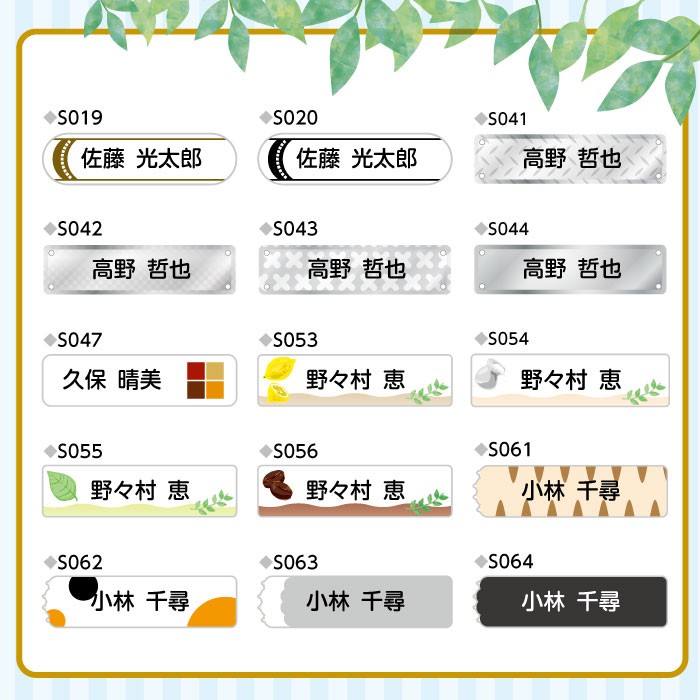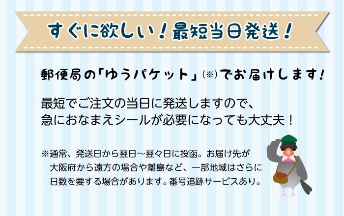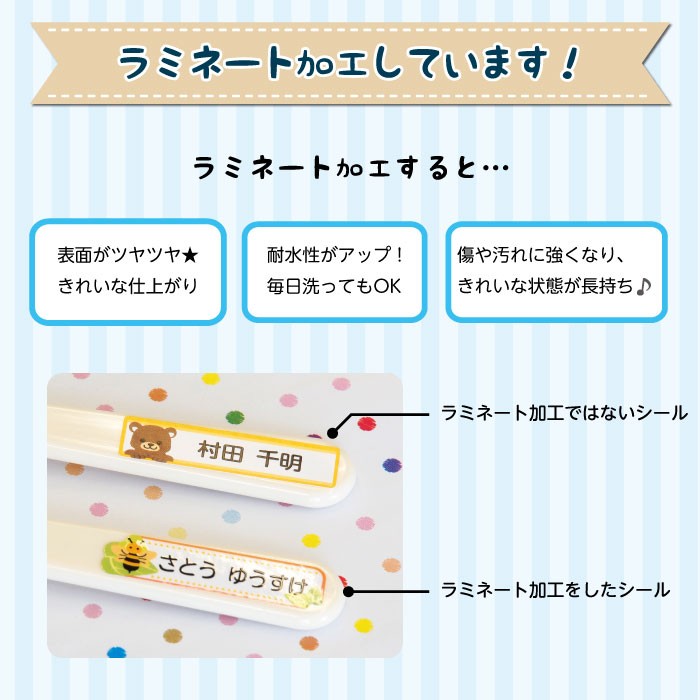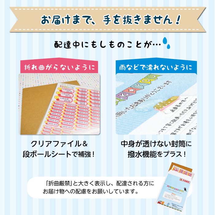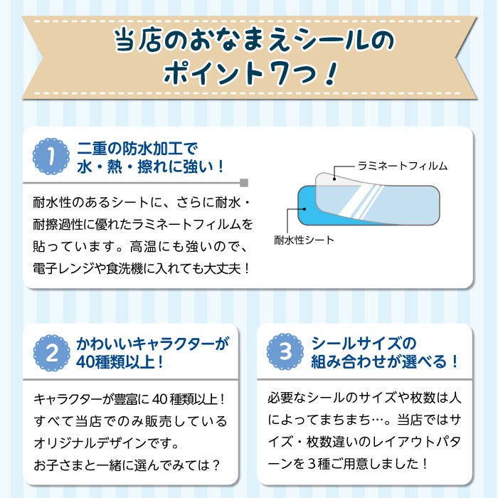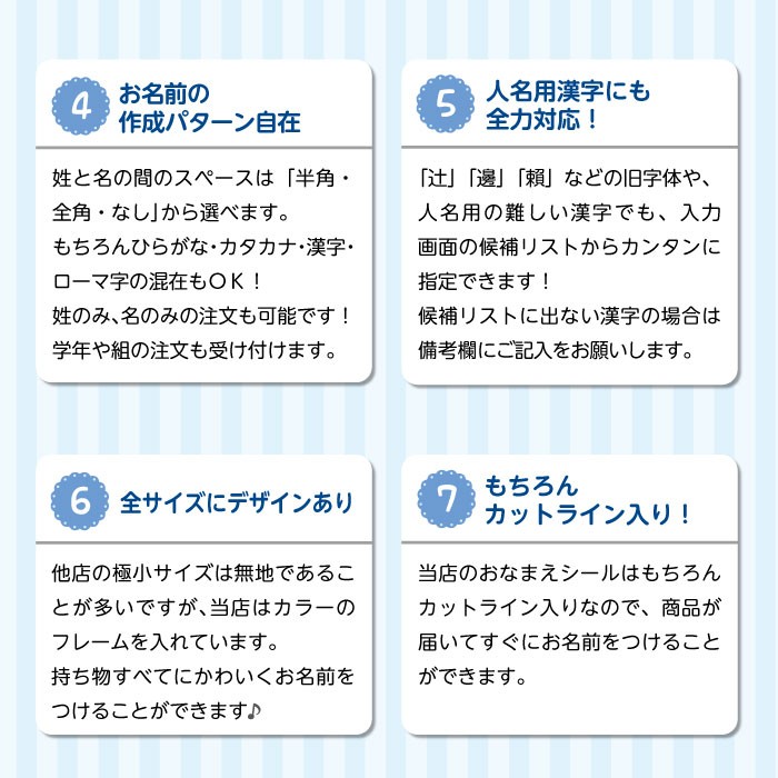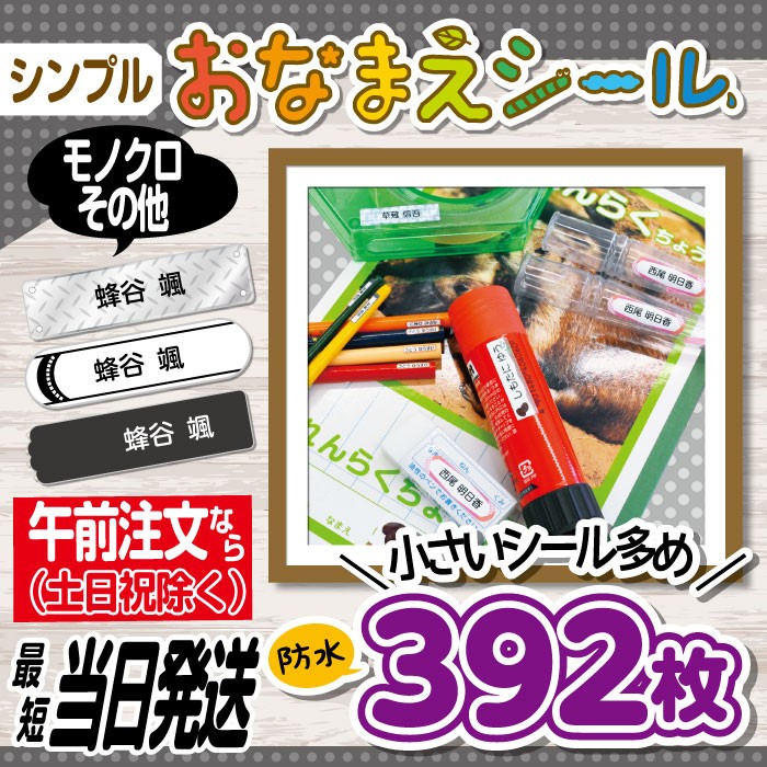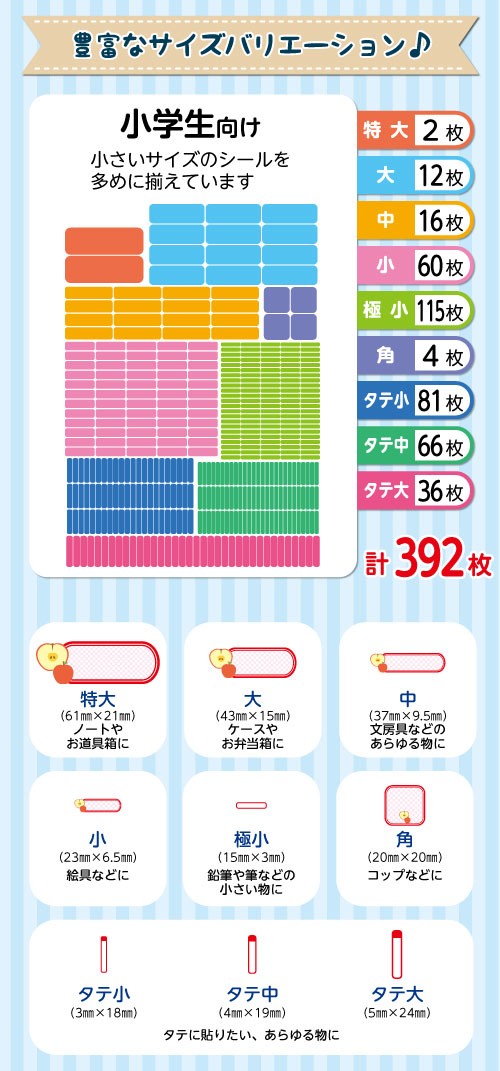 入園準備・入学準備の際の大変なお名前付けをラクにしてくれる「お名前シール」♪ こちらは小学生向けの392枚が、A4サイズ1枚に印刷されています。 もちろん、カットライン入りではがしやすい★ 防水シート&ラミネート加工で、食器類に貼っても安心。 電子レンジ・食洗器にも対応しています。 お名前は、ひらがな・カタカナ・ローマ字・漢字をご利用いただけます。(混在もOK) ※名前シールを旧字体で制作ご希望のお客様は、ご注文時に「ストアへのご要望欄」にご記入ください。 可能な限りご対応させて頂きます(ご対応できない場合もございます) <内容> 特大 61mm×21mm *2枚 大 43mm×15mm *12枚 中 37mm×9.5mm *16枚 小 23mm×6.5mm *60枚 極小 15mm×3mm *115枚 角 20mm×20mm *4枚 タテ小 3mm×18mm *81枚 タテ中 4mm×19mm *66枚 タテ大 5mm×24mm *36枚 合計392枚 <素材> 防水タック紙(表面PPラミネート加工) |