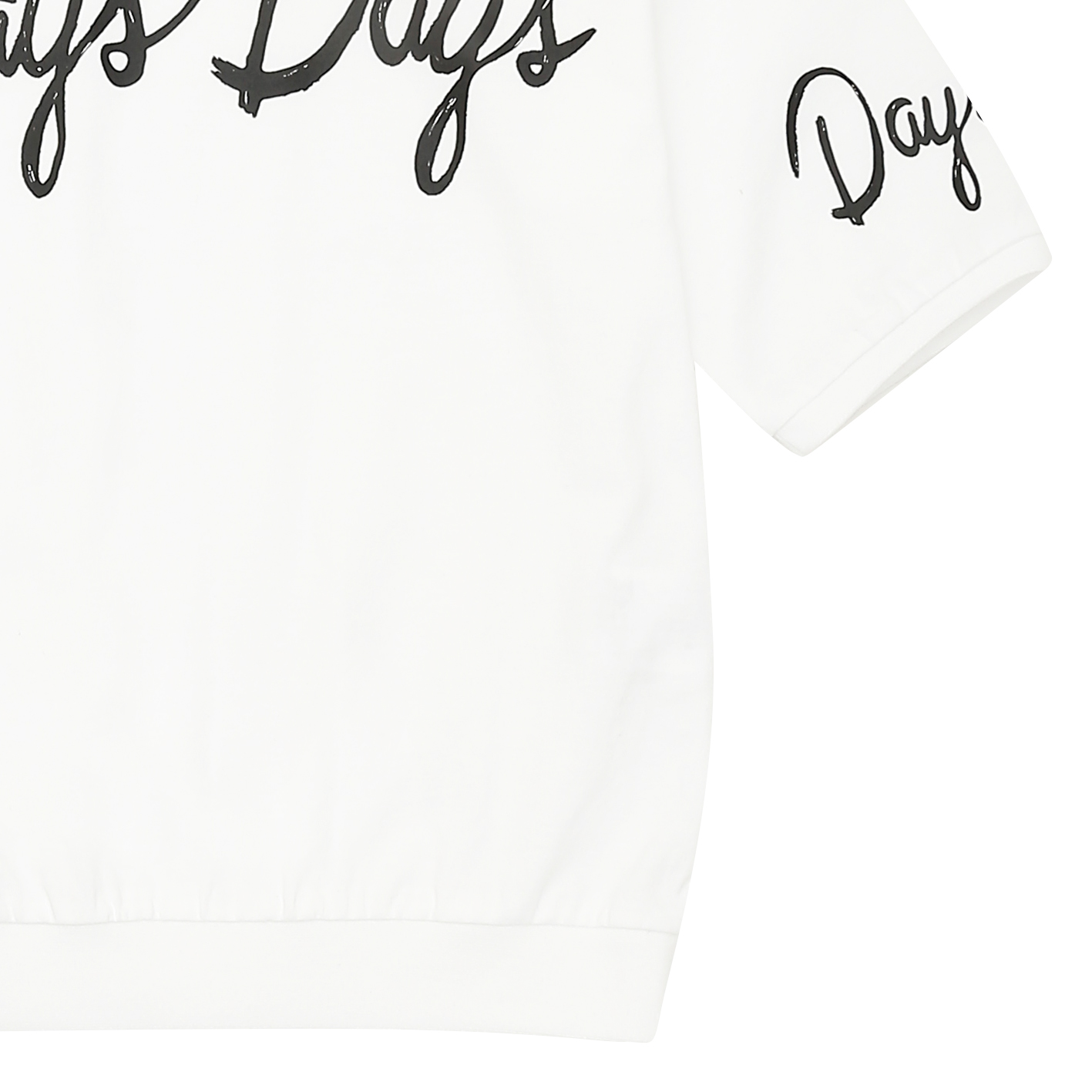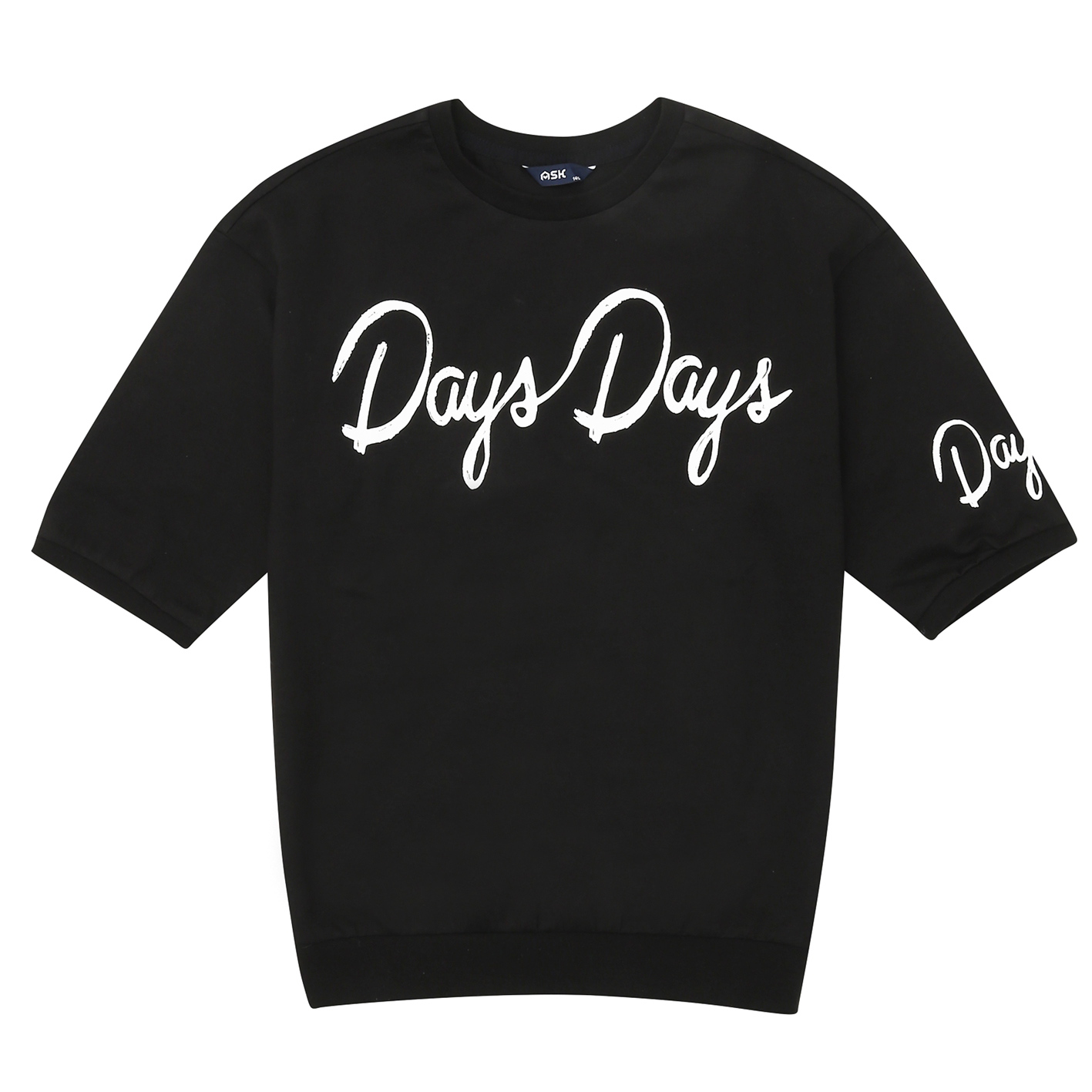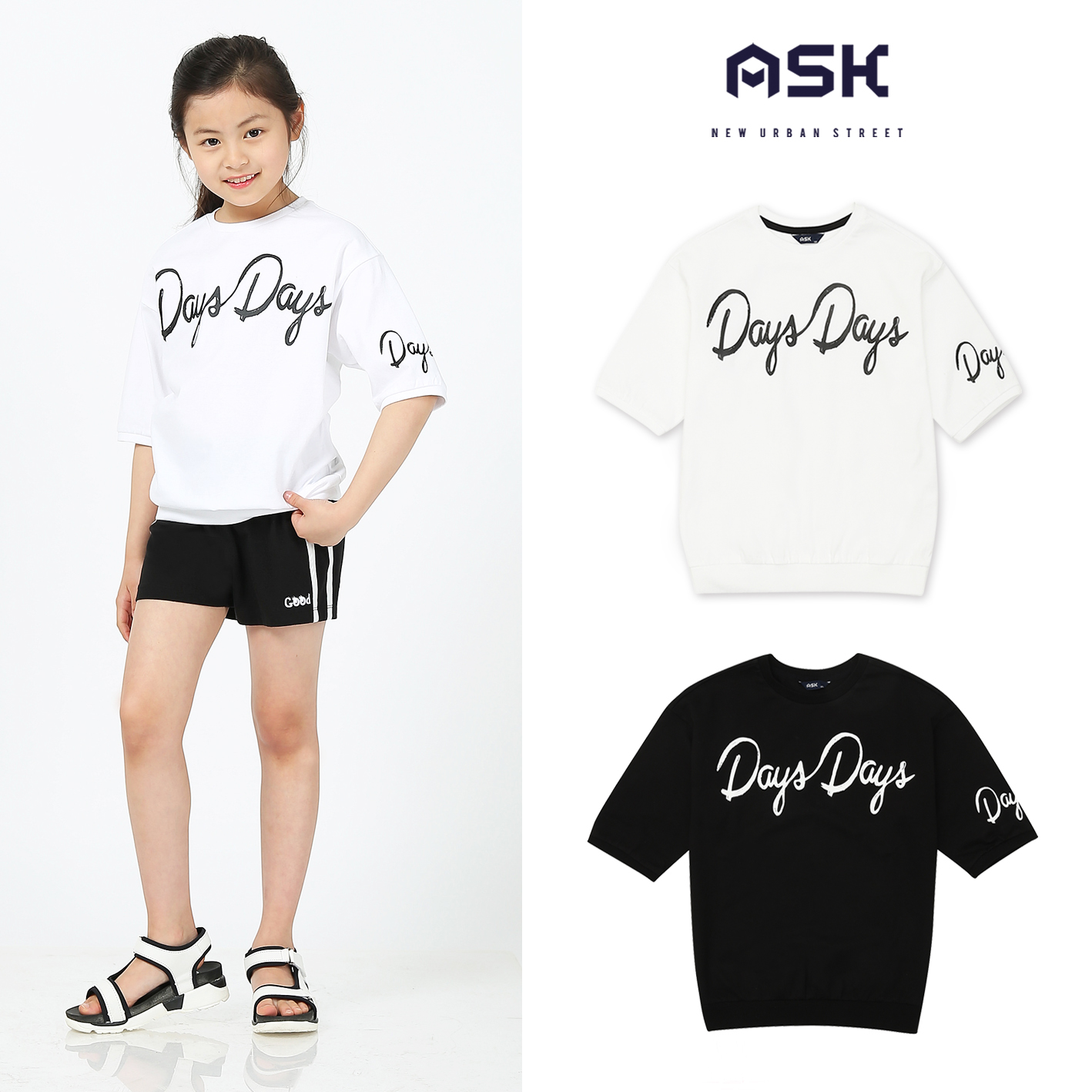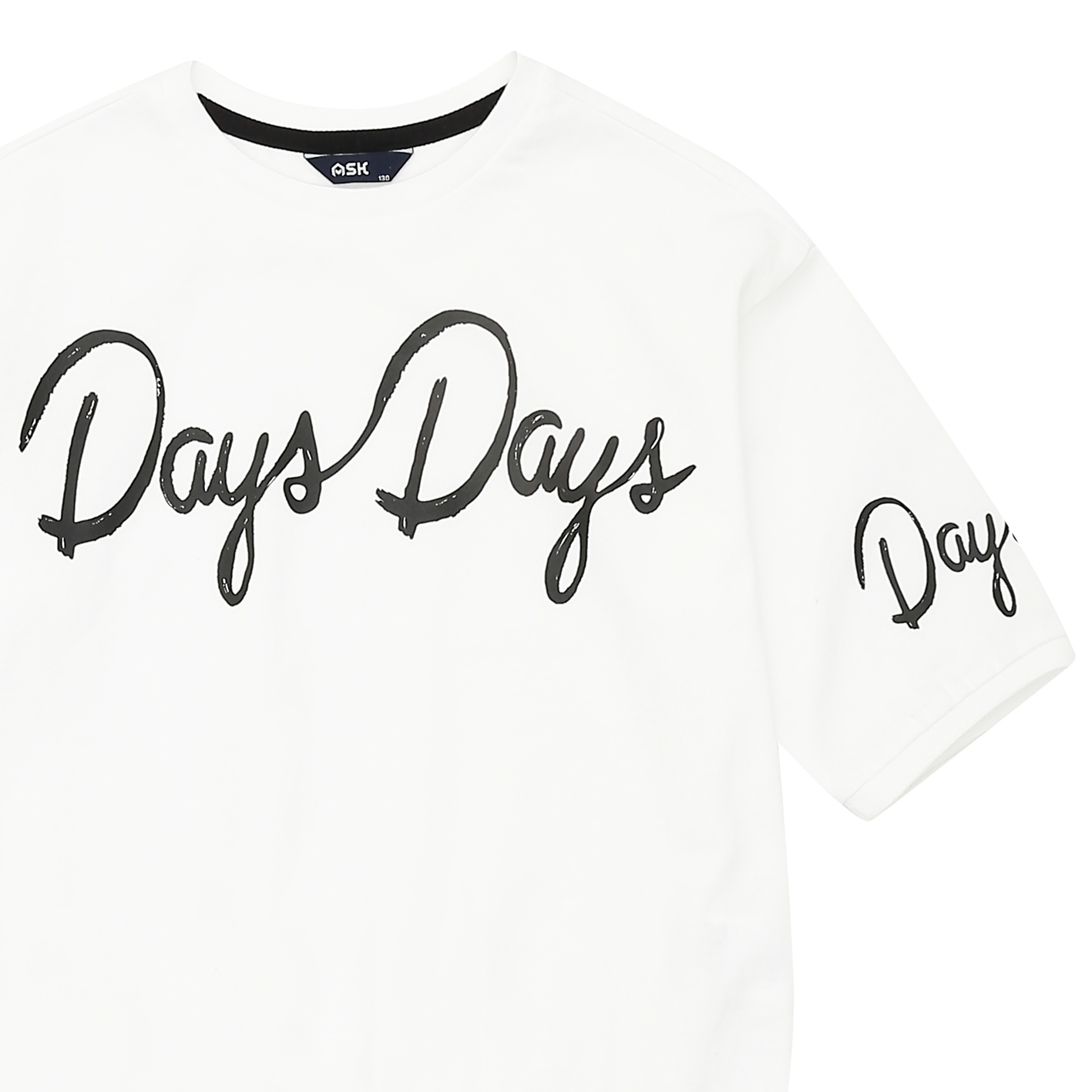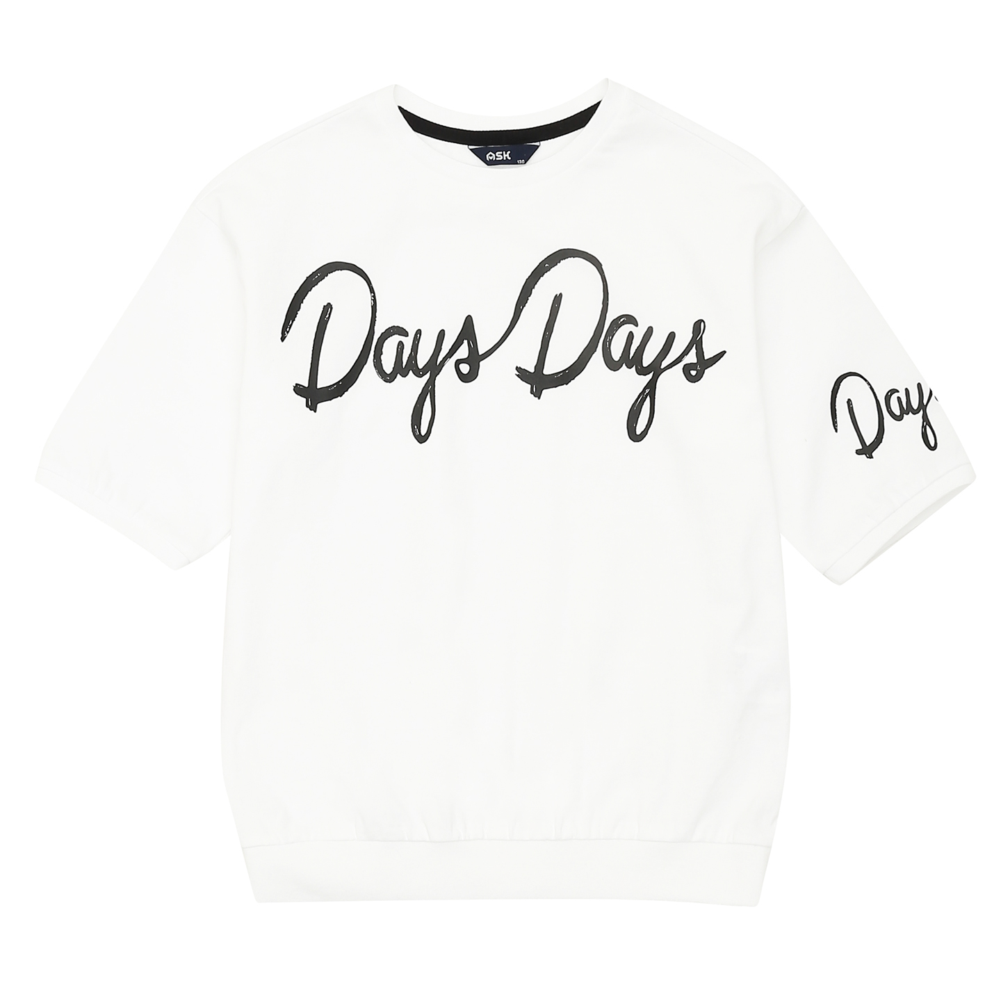 20수 MVS 싱글 소재의 6부 티셔츠. 가슴과 소매에 필기체 나염을 포인트로 준 스타일. 박시한 핏으로 저학년부터 고학년까지 판매하기 좋은 아이템.