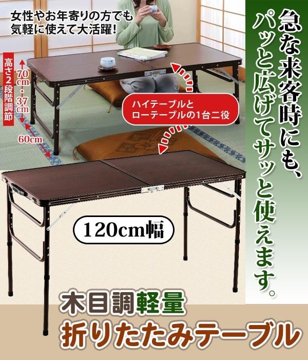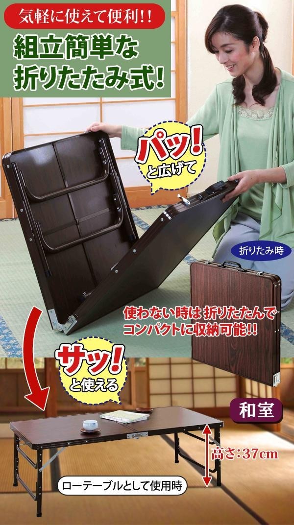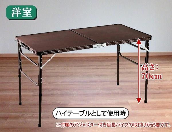 | 女性やお年寄りの方でも気軽に使えて大活躍!!軽くて丈夫なアルミ製の折りたたみテーブルです。使わない時は折りたたんでコンパクトに収納できます。付属の延長パイプを取り付ければ、ハイテーブルとしても使用可能。シンプルなデザインなので、和室でも洋室でもお使いいただけます。 |