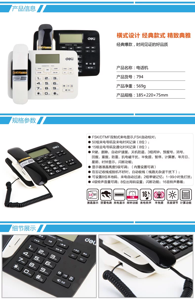 R keys, delete, automatic IP Speed Dial, shutdown theft, three groups alarm clock, forecasting numbers, consumer number, call back, redial, lightning, anti-electromagnetic interference, half speakerphone, pause,