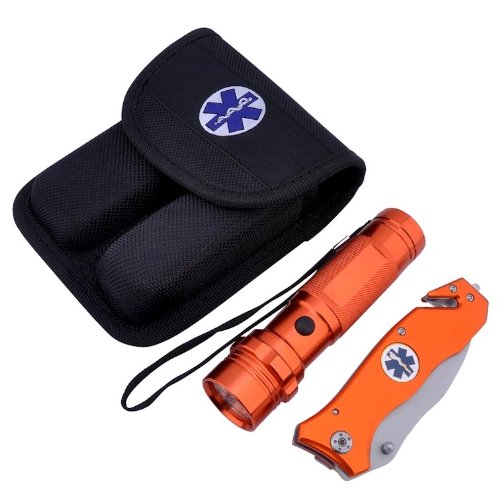 Studio : CKB Products Publisher : CKB Products Binding : Sports Product Description Orange Emergency (EMS) Knife and Flashlight Combo Set by BarTech Pro This fully functional EMT/EMS knife and flashlight combo pack with heavy-duty nylon case is perfect for everyday use or for display. Each set is packed in a crush resistant box. The flashlight is safely wrapped in bubble paper for protection and the knife is wrapped in cellophane for protection against scratching. We now offer custom laser engraving to both the flashlight and knife for only $5.00. This is a unique way to personalize this knife and flashlight set making it great for gift-giving. EMS Flashlight: The flashlight is EMT/EMS orange! The flashlight uses 3 "AAA" batteries (not included) and has 14 ultra-bright LED lights that last up to 20 years! The flashlight has a handy lanyard for easy transport. The push-button on/off switch is located on the front of the flashlight and is tested for durability. The flashlight is 4-7/8" long and about 1-1/4" in diameter. Our EMS flashlight is made from high-quality aluminum that will not scratch or dent easily. EMS Knife: The knife in this set is EMT/EMS orange and features a sturdy lockback design and a genuine EMT/EMS logo medallion in the center. Use the glass breaker or seat belt cutter in any emergency where it is needed. The stainless steel clip and thumb stud round off this incredible and versatile knife. The aluminum knife measures 8" open, 4-3/4" closed and the stainless steel blade is 3-1/2". EMS Pouch: The heavy-duty nylon pouch features two belt loops on the back so it can securely attach to any belt. There are two compartments, one for the EMS flashlight and the other for the knife. There is a stitched EMS logo seal on the front of the pouch adding to this products authenticity and overall appeal. The pouch Velcro's shut for a tight closure, keeping your knife and flashlight safe and secure inside the pouch. Suggested Retail Price $39.95 1.00 pound each, Item EMTKFCOM 0
