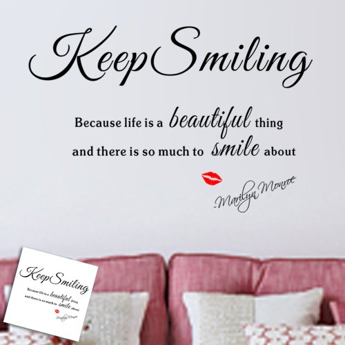-. Binding : Kitchen -. Brand : ce -. EAN : 0766330190858 -. Feature : Made with High Quality Indoor Matte finish Vinyl / Safe for Home Décor use, easily removable without harming your surface / Can be applied to any smooth or semi-smooth surfaces - mirrors, doors, furniture and walls / Great decoration that looks hand painted on your walls after applying it. -. IsAutographed : 0 -. Label : ce -. Manufacturer : ce -. ProductGroup : Home -. ProductTypeName : HOME -. Publisher : ce -. Studio : ce -. Title : Keep Smiling Classic Quotes Wall Decal Decor with Red Kiss Removable Vinyl Mural Art Wall Sticker for Home Decor -. UPC : 766330190858