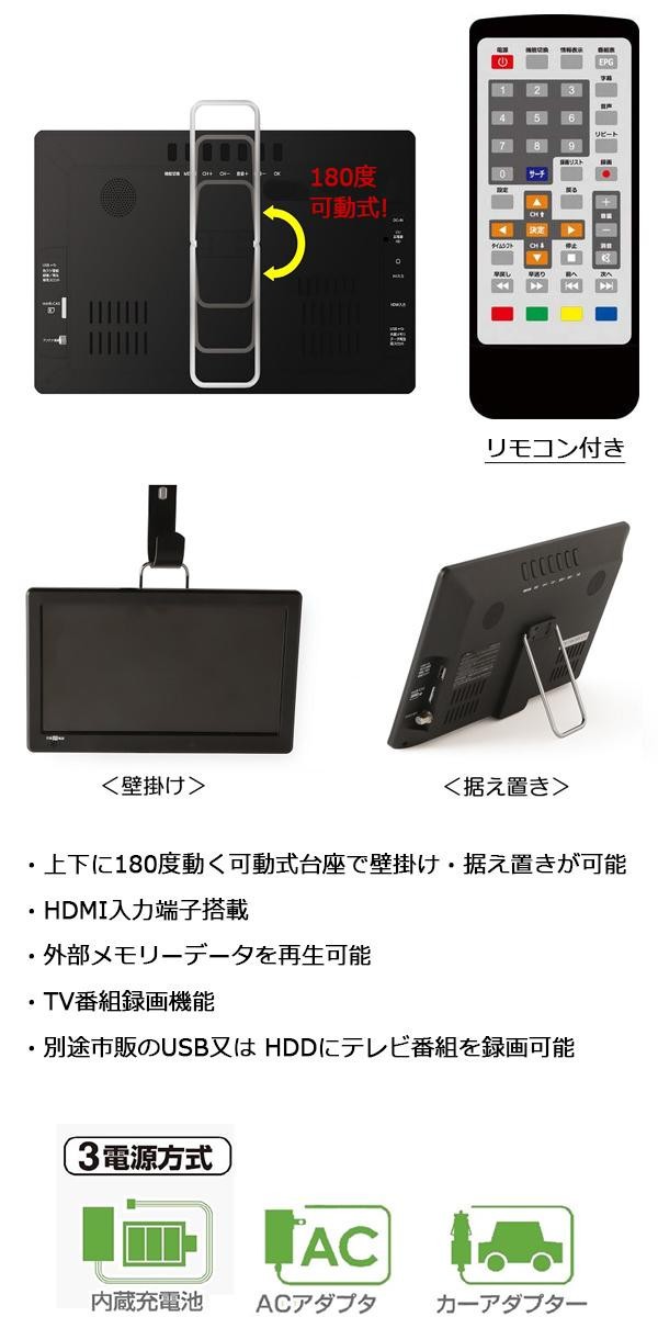 ご家庭ではもちろん、ドライブ中やレジャーなどお好きな場所でお楽しみいただけます。HDMI入力端子を搭載しているので、外部メモリーデータを再生できます。TV番組録画機能もありますので、お手持ちのUSB又はHDDにテレビ番組を録画することができます。電源はAC/DCアダプターと充電バッテリーの便利な3電源対応です。 |