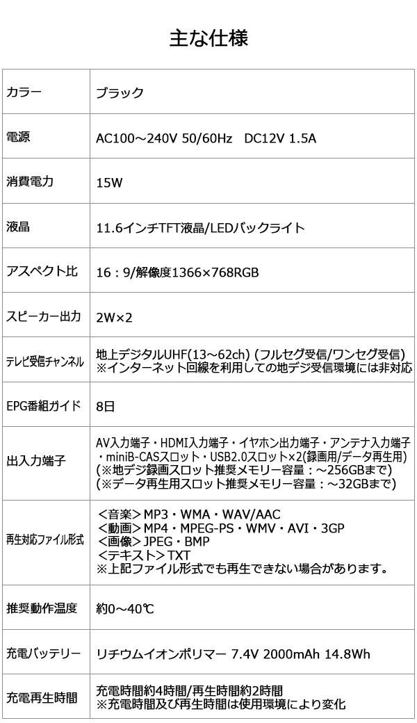| 付属品 | リモコン(テスト電池付き)、ACアダプター、車載用DCアダプター、簡易TVアンテナ(屋外用)、イヤホン(φ3.5mm)、車載用バック、miniB-CASカード、AVケーブル、取扱説明書、保証書(保証期間:1年間) |