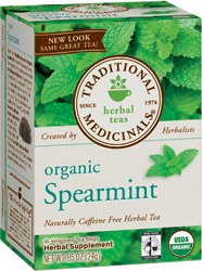 Fair trade certified spearmint herbal tea. Pleasantly aromatic and sweet. Caffeine free.