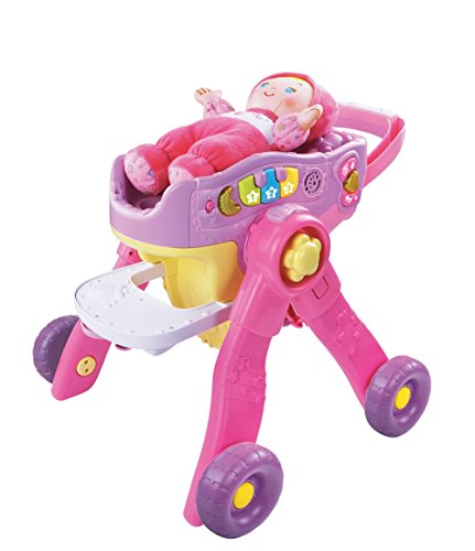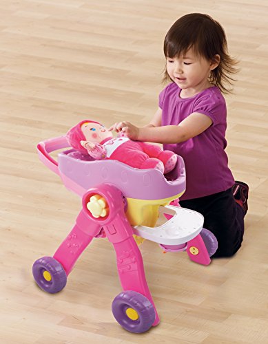 The Baby Amaze 3-in-1 Care and Learn Stroller by VTech has three fun ways to play and learn with your baby doll! Place the included baby doll in the stroller and go on a pretend walk. The stroller's smart sensor recognizes when it's being moved and plays sing-along songs about letters, colors, places and animals. Transform the stroller into a high chair to hear baby care reminders that introduce nurturing concepts and healthy habits while you pretend to feed your doll. Turn the book’s page on the tray to learn about different foods and nutrition. Transform the high chair into a bassinet, and your doll can fall asleep while listening to classic nursery rhymes or 20 familiar lullabies. The 3-in-1 Care and Learn Stroller also has number keys that introduce numbers and counting and plays piano sounds in music mode. With three ways to play, this stroller is packed with role-play fun! Requires 2 AA batteries (batteries included for demo purposes only; new batteries recommended for regular use). Intended for ages 2 to 5 years.Feature