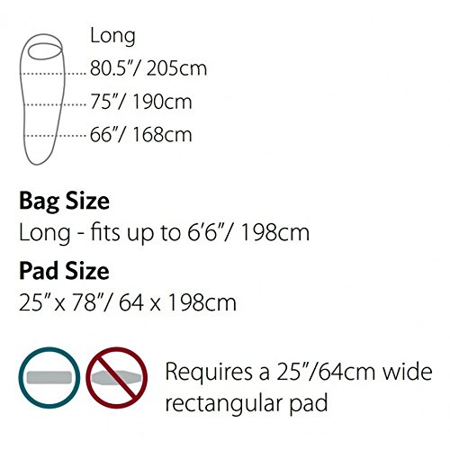 WEIGHT: Bag Weight 2lb 15oz, Fill Weight 21oz. DIMENSIONS: Heights up to 6'6'', Shoulder Girth 80.5'', Hip Girth 75'', Foot Girth 66'', Stuff Sack Size 8''x17.5'', Compressed Bag Size 8''x10'', Fits Pad Size 25''x78''.