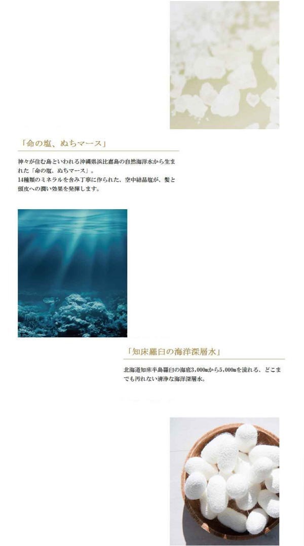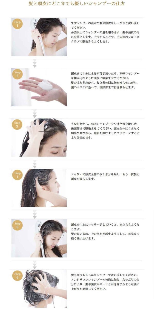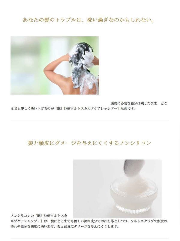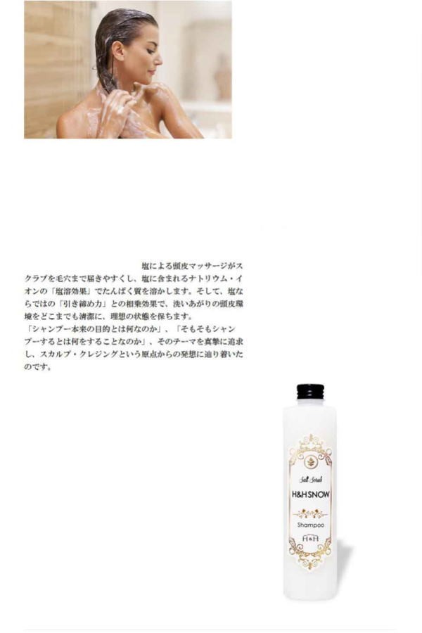 | 商品詳細 | スクラブとシャンプーが同時にできる ソルトスカルプシャンプー 洗浄力に優れた塩を配合 とろけるようなスクラブで、 マッサージしながら頭 皮環境を清潔にし、 美髪へと導きます |