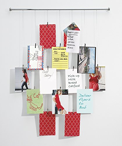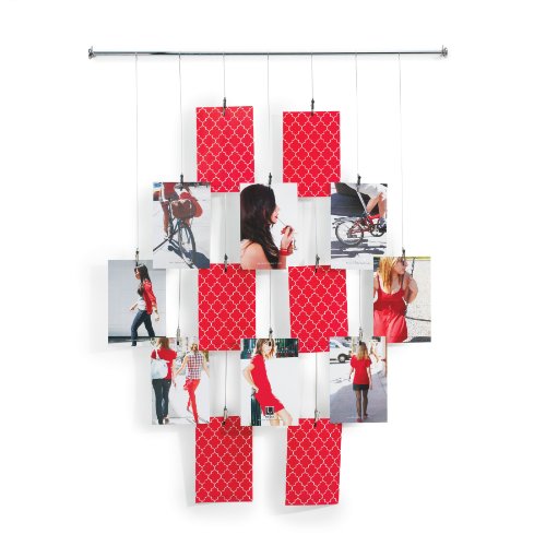 Display snapshots, greeting cards, postcards, or other mementos with the Tangle photo holder by Umbra. Seven wire cables are suspended in fixed positions from a 24-inch-long nickel-finish metal bar that mounts to the wall. Fourteen metal clips, arranged in staggered rows of two, three, and four, hold a variety of items securely without damaging them. For best results, use with items up to 4-by-6-inch in size. Unit measures 24 by 24-inch overall. Great for home or office, Photoline also makes a stylish memo-holder. Designed by Alan Wisniewski for Umbra- original, modern, casual, functional and affordable design for the home.