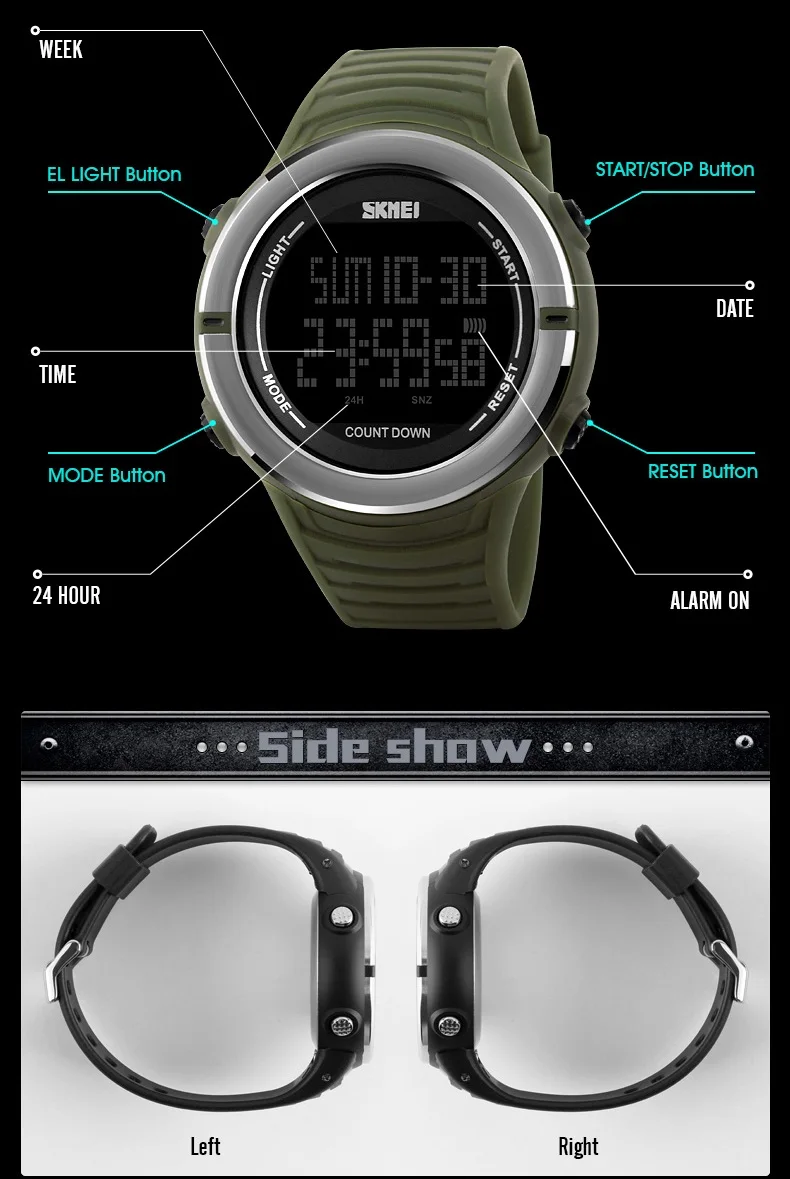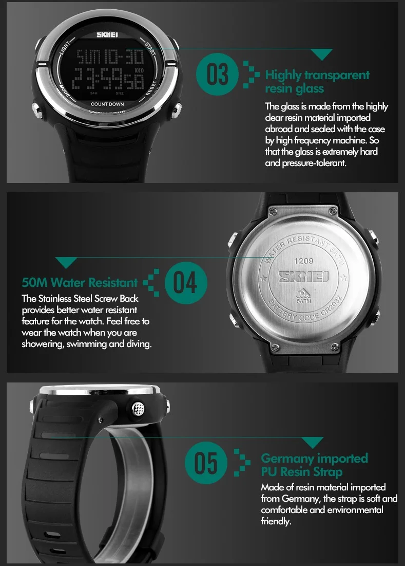 Feature:Alarm,Back Light,Water Resistant,Shock Resistant,Stop Watch,Complete Calendar,Multiple Time Zone,Auto Date,LED display