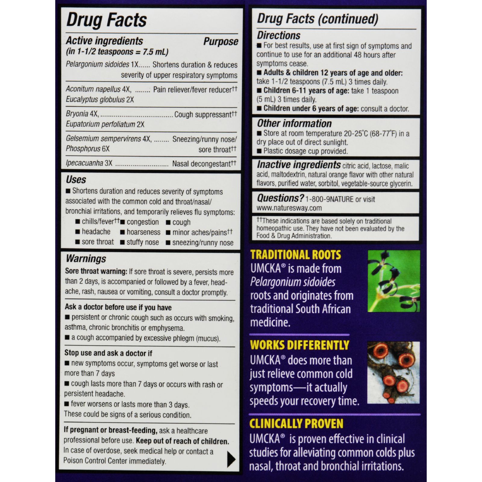 | Nature's Way Umcka Cold and Flu Sugar-Free Syrup Orange Description: Multi-Action Natural Relief Aches/Pains, Congestion, Cough, Fever, Runny Nose, Sore Throat Clinically Proven Pelargonium sidoides 1X PLUS Alpha CF Suitable for Children Non-Drowsy 98% Alcohol Free Feel better Faster! Clinically tested UMCKA shortens the duration and reduces the severity of throat, sinus and bronchial irritations. It provides effective relief of upper respiratory tract irritations. Unlike other remedies that simply mask symptoms, UMCKA helps you recover faster! Ingredients : Pelargonium Sidoides, Aconitum Napelius, Bryonia Alba, Gelsemium Sempervirens, Ipecacuanha, Citric Acid, Malic Acid, Natural Orange Flavor, Purified Water, Sorbitol, Vegetable Source Glycerin Size : 4 FZ Pack of : 1 Product Selling Unit : each |