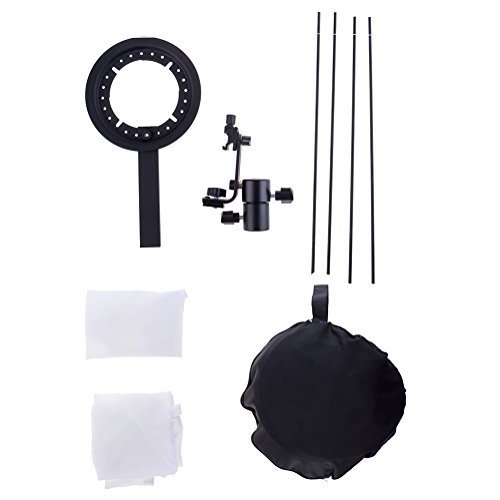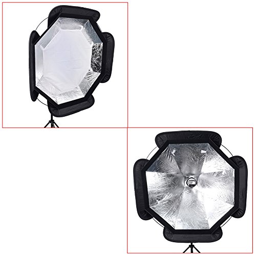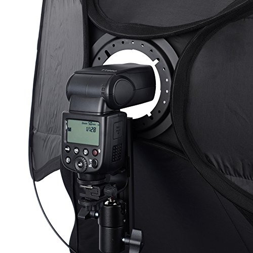 - Feature : This fancy designed softbox is made of heavy black fabric with a silver reflective interior. / Easy to assemble exterior ribbing maintains the shape of the softbox. / This softbox comes with a bracket that fits Canon and Nikon compatible speedlites. Adapters are available to fit other types of speedlites, such as Sony. / Includes soft front diffusion panel, secondary interior diffusion panel, tilting light stand clamp, and a carry/storage pouch bag. / Foldable for easy storage.