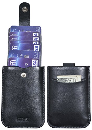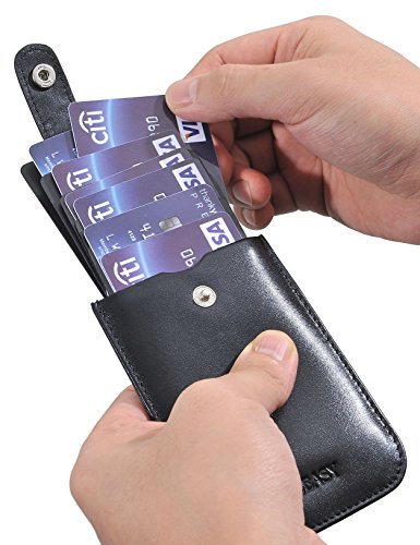 -. Feature : DURABLE GENUINE LEATHER & SLIM: Made of 100% top quality genuine leather, our card holder is more soft and durable than those made of cloth or PU leather. Also it's very slim and very easy to put in pockets. / 6 CARDS & SEVERAL BILLS CAPACITY: This credit card holder can hold up to 5-6 cards easily in its main compartment, along with a slot behind for 3 to 5 bills folded in quarter. / CONVENIENT STRAP WITH BUCKLE CLOSURE: You can pull strap out and put inside back by pressing cards inside, and there is a snap button on the strap to close the pocket which helps to secure cards. / RFID SECURITY: The slim card holder are equipped with Advanced RFID SECURE Technology to protect your vital data from scanning, be security with this card wallet / SATISFACTION GUARANTEED: We offer 100% no risk money-back guarantee, Refund or Replacement,YOUR PURCHASE IS RISK-FREE