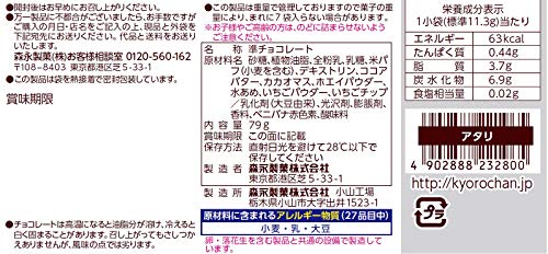 原材料:砂糖、植物油脂、全粉乳、乳糖、米パフ(小麦を含む)、デキストリン、ココアバター、カカオマス、ホエイパウダー、水あめ、いちごパウダー、いちごチップ/乳化剤(大豆由来)、光沢剤、膨脹剤、香料、ベニバナ赤色素、酸味料