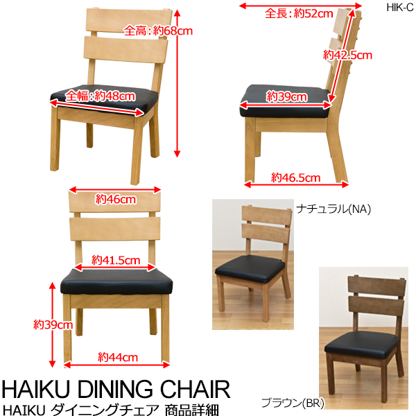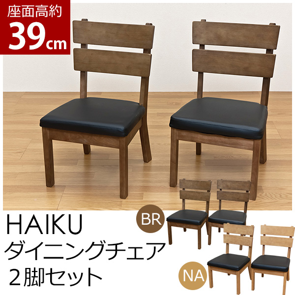 本商品はお取り寄せ商品のため、稀にご注文入れ違い等により欠品・遅延となる場合がございます。誠に恐れ入りますが、何卒ご了承ください。 また、以下の場合には追加送料がかかる場合がございます。  ・大型商品の複数購入時 ・同梱区分が異なる商品の複数購入時  【出荷目安】:1 - 4営業日 ※土日・祝除く 【同梱区分】:TS 1490 【梱包サイズ】:大型商品 【代引き決済】:不可  配送伝票の依頼主は出荷元(メーカーもしくは仕入元)名となる場合がございますので、お受け取りの際はご注意ください。   【型番】HIKC  【商品名の色やサイズについて】 こちらは「ダイニングチェア/リビングチェア 【2脚入り】 座面高39cm 木製 張地:合成皮革/合皮 HAIKU ブラウン」の商品ページです。商品画像や商品情報には、色違いやサイズ違いの商品が載っている場合がございます。ご注文前に色・サイズ・セット内容のご確認をお願いいたします。  HAIKU ダイニングチェア 2脚入りです  モダンな和風スタイルです 座面はお手入れ簡単な合成皮革です 座面高は低めな約39cmです ご年配の方も座面の幅も広めなのでゆったり落ち着いて座れます  ブラウン(BR)、ナチュラル(NA)の2色展開です  ※ホルマリン、スチレンを含まない非中毒性の仕上げ原料を使用しておりホルマリン放出量はJIS規格(A5908:2003)におけるF★★★★(0.04mg/l未満)の必要条件を満たしておりますので安心してお使いいただけます  幅480×奥行520×高さ680mm(梱包サイズ:幅650×奥行480×高さ820mm) 座面高:約390mm 本体重量:1脚 7kg(梱包重量:18kg) 完成品(1個口) 天然木(ラバーウッド) ポリウレタン樹脂塗装 チェア座面:合成皮革 内材:ウレタンフォーム  原産国:タイ  【ご注意事項】 ※本商品は、北海道・沖縄・離島への配送はいたしかねます。あらかじめご了承ください。