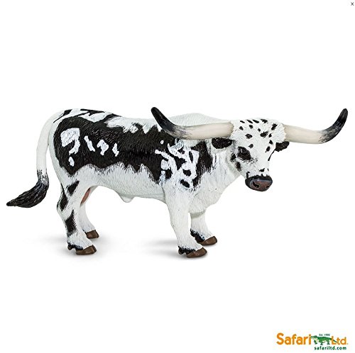 -. Feature : EASILY SPOTTED: Texas Longhorns are easily recognizable by their namesake horns. The span between them can reach almost seven feet wide! Longhorns are highly desirable for their resistance to disease and ability to survive in difficult conditions such as droughts. / SPANISH BOVINE: Texas Longhorns are one of the oldest breeds of cattle in the Americas, brought by Spanish colonists including Christopher Colombus. Their ancestors were a genetic hybrid of the European (taurine) and Indian (zebu) breeds of cattle. / MADE WITH INDUSTRY-LEADING STANDARDS: Like all Safari Ltd products, this figurine has been individually hand painted, features quality construction from phthalate and lead-free materials, and includes an educational hangtag in 5 languages. / REALISTIC APPEARANCE FOR MULTIPLE USES: Realistic, educational, and fun, this figurine is suitable for a range of interests, including collectors, enthusiasts, teachers, and kids. Admire it on a shelf, use it in the classroom, or simply enjoy playing with it. / PRODUCT SPECIFICATIONS: At 5 ½ inches long and 3 inches tall, this Texas Longhorn figure is about the size of a standard index card. The figure features an updated coloration, with a black and white mottled coat, cream colored horns with black tips, brown hooves, and a pinkish gray nose.