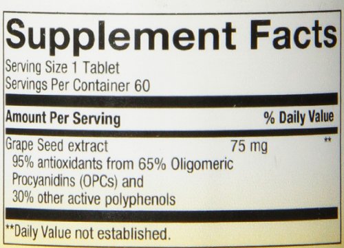 Suggested Use As a dietary supplement adults and children over age 12 take 3 tablets for every 75 lbs of body weight daily for 2 weeks, thereafter 1 tablet for every 50 lbs of body weight daily. Children ages 4-11 use half the adult amount - Or as directed by your healthcare professional. Supplement FactsServing Size: 1 TabletServings Per Container: 60Amount Per Serving% Daily Value***Grape Seed extract 95% antioxidants from 65% Oligomeric Procyanidins (OPCs) and 30% other active polyphenols75 mg ***Percent Daily Values are based on a 2,000 calorie diet