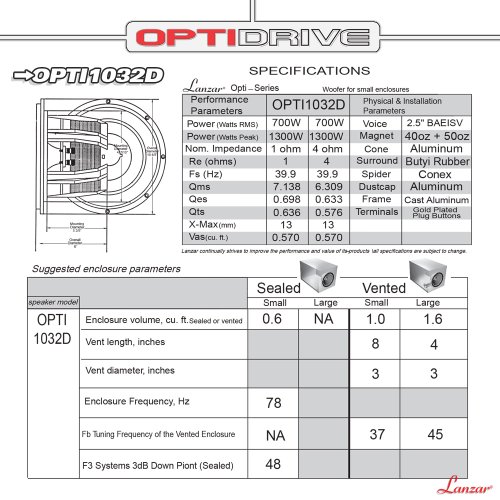 Lanzar OPTI1032D OptiDrive 10-Inch Die Cast Aluminum Cone Dual Voice Coil 2 Ohm Subwoofer