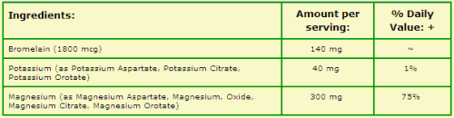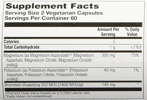 Studio : Solaray Publisher : Solaray Binding : Misc. Product Description Description:Magnesium and Potassium Asporotates with Bromelain dietary supplement. A highly advanced mineral supplement in a special herb base. This highly advanced formula consists of magnesium and potassium which have been combined with aspartic acid, citric acid, and a special delactosed whey protein concentrate containing naturally occurring orotic acid. Each capsule contains magnesium and potassium which have interacted with the other natural compound producing a natural chelation process resulting in the formation of a special complex containing Magnesium- Potassium Asparate, Magnesium- Potassium Citrate, and Magnesium-Potassium Orotate. Contains none of the yeast or soy commonly found in full range amino acid chelates. Size: 120ct Directions:As a dietary supplement, take 1 capsule in the morning and 1 capsule in the evening with meals or with a glass of water. Serving Size: 2 Capsule 60 Servings per container Ingredients:Amount per serving:% Daily Value: Bromelain (1800 mcg)140 mgPotassium (as Potassium Aspartate, Potassium Citrate, Potassium Orotate)40 mg1%Magnesium (as Magnesium Aspartate, Magnesium, Oxide, Magnesium Citrate, Magnesium Orotate)300 mg75%Key to Ingredients: = Daily Value not established. = Percent Daily Value is based on a 2,000 calorie diet. = Values differ depending on age = Values differ depending on age Other Ingredients: Gelatin (capsule), magnesium stearate, cellulose, Rosemary (leaves), Hawthorn (berries), Motherwort (herb) and silica Other: See product label for more information. 0 |