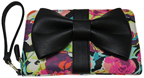 Feature : Zipper Around Top, Size 8.5"x5.5", Multi Flower Print / 4 Inside Pockets, 12 Credit Card Slots, I.D. Slot / Inside Zippered Pocket, Big Black Bow on Front