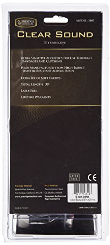 -. Binding : Health and Beauty -. Brand : Prestige Medical -. Feature : Single Head Acrylic Stethoscope / Ultra-sensitive acoustics / Accurate through up to 10 layers of terrycloth towels / High-impact shatter-resistant acrylic resin / Available in a variety of cool colors also diamond-shaped head Betty Boop pink ribbon and happy face designs -. Label : Prestige Medical -. Manufacturer : Prestige Medical -. MPN : S107-SML -. NumberOfItems : 1 -. PackageQuantity : 1 -. PartNumber : S107-SML -. ProductGroup : Health and Beauty -. ProductTypeName : HEALTH_PERSONAL_CARE -. Publisher : Prestige Medical -. Studio : Prestige Medical -. Title : Prestige Medical Clear Sound Scope
