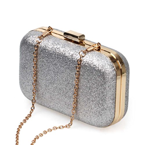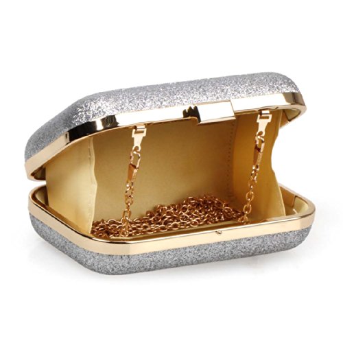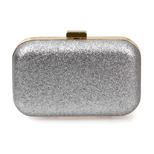 BMC Iridescent Bright Silver Glitter Covered Fabric Hard Case Alloy Chain Strap Fashion Evening Clutch