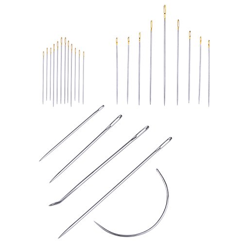 -. Feature : Hand sewing needles set: 26 pieces needles includes 21 pieces gold eye needles and 5 pieces leather canvas repair sewing needles / Good quality material: hand sewing needles are made of nickel-plated steel, stout and strong, do not bend easily while hand sewing / Large holes and thick needles: 5 pieces canvas repair needles with large holes allow you to thread easily even without reading glasses, fit for repairing carpets, leather, couch / Smooth fabric and easy to thread: 21 pieces embroidery needles with gold holes are smooth to thread standard cotton or ribbon fit for yarn knitting / Wide application: gold eye and curved needles set are suitable for sail repair, upholstery work, canvas, proper saddle stitch, yarn knitting, cotton or ribbon crafts, etc.