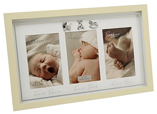 -. Feature : A simplistic ivory collage photo frame for a newborn baby from Haysom Interiors. / Free standing and suitable to be wall hung. Perfect gift idea for a newborn baby. / This frame holds three 4" x 6" photo's with text under each space which reads 'First Smile', 'First Bath', and 'First Step'. / Finished with pretty rocking horse, teddy bear and stroller icons above the photos. / Overall measurements are 16" x 10".