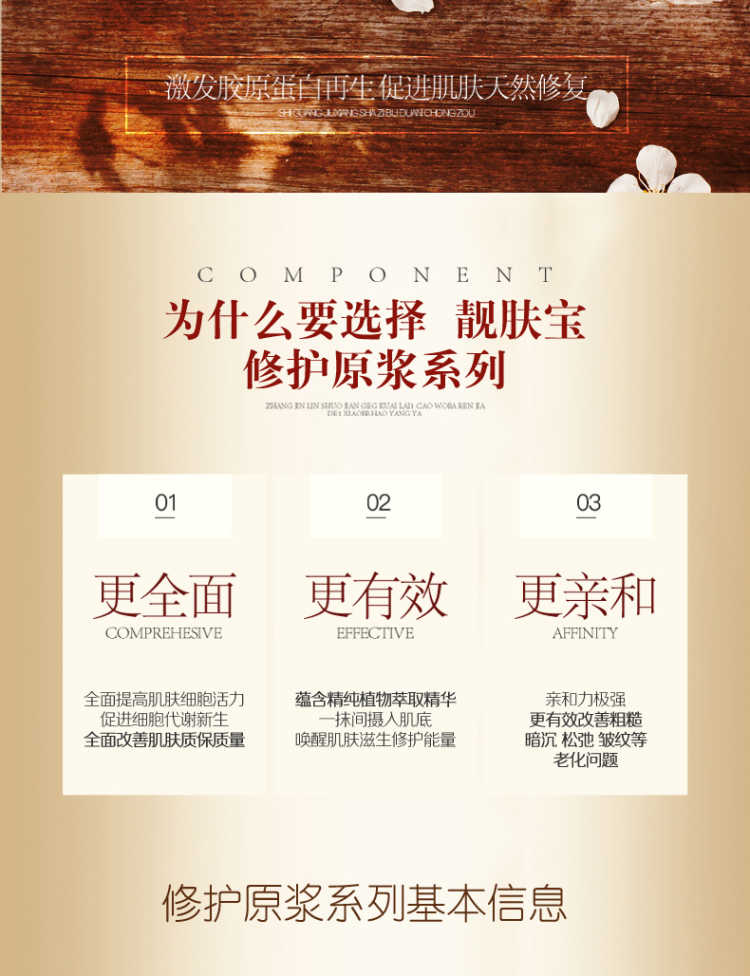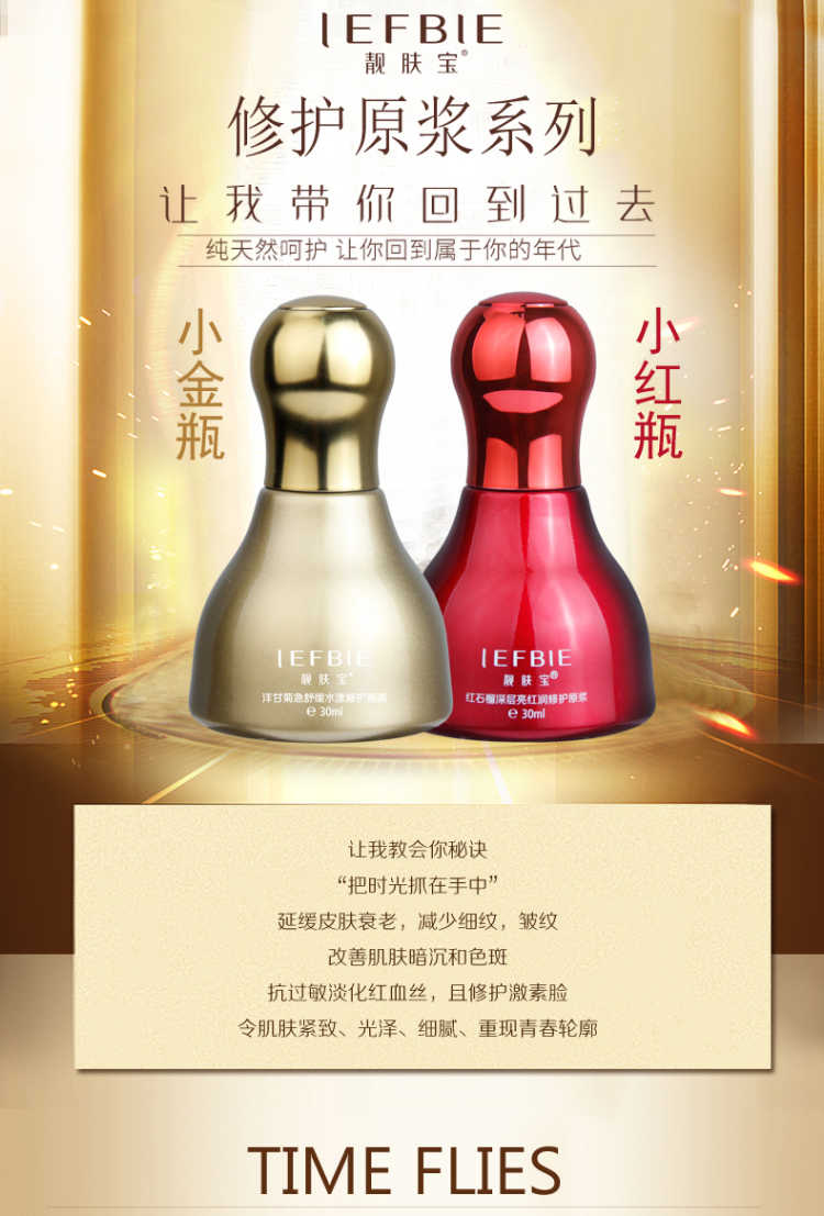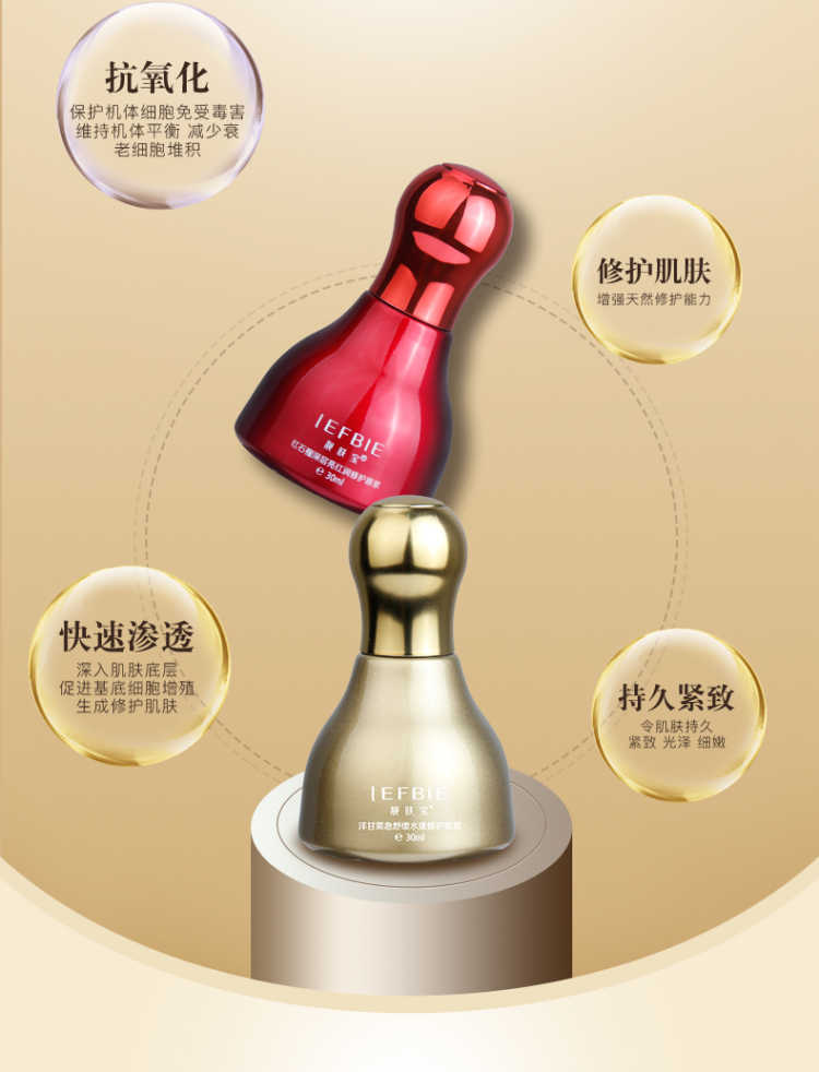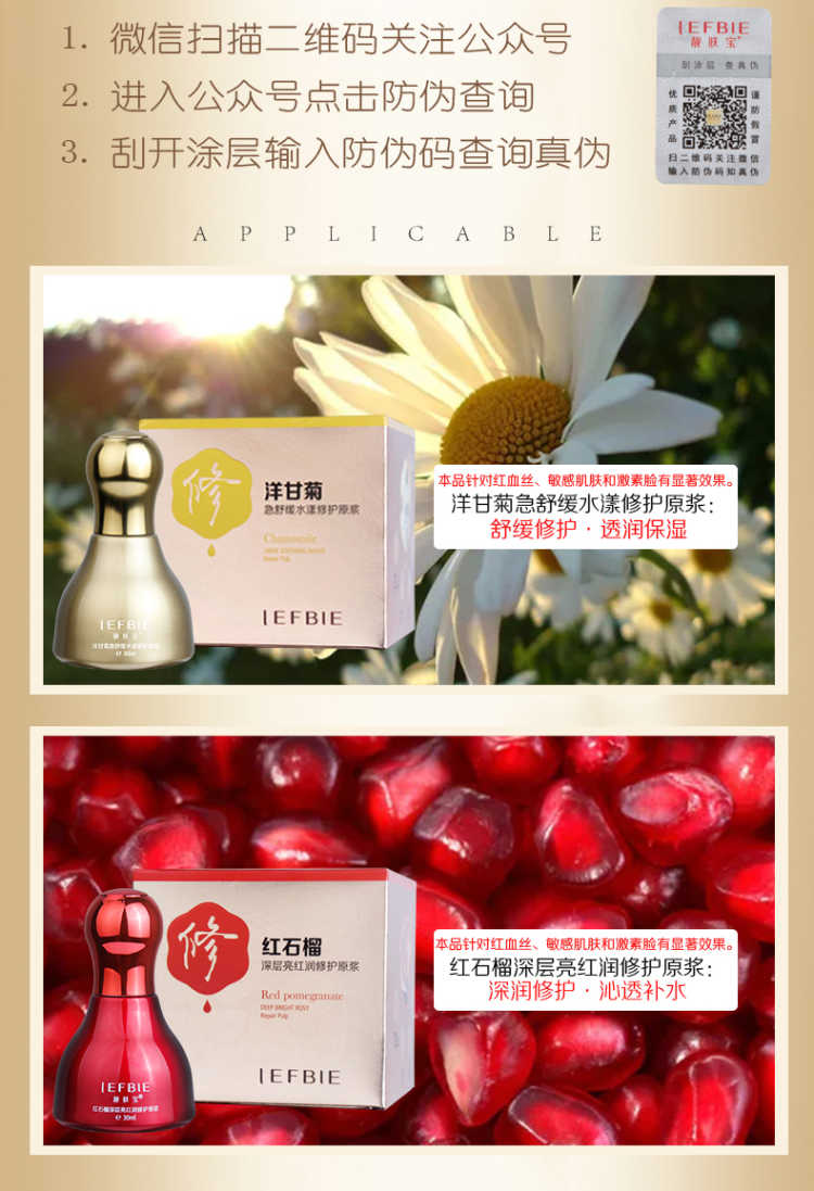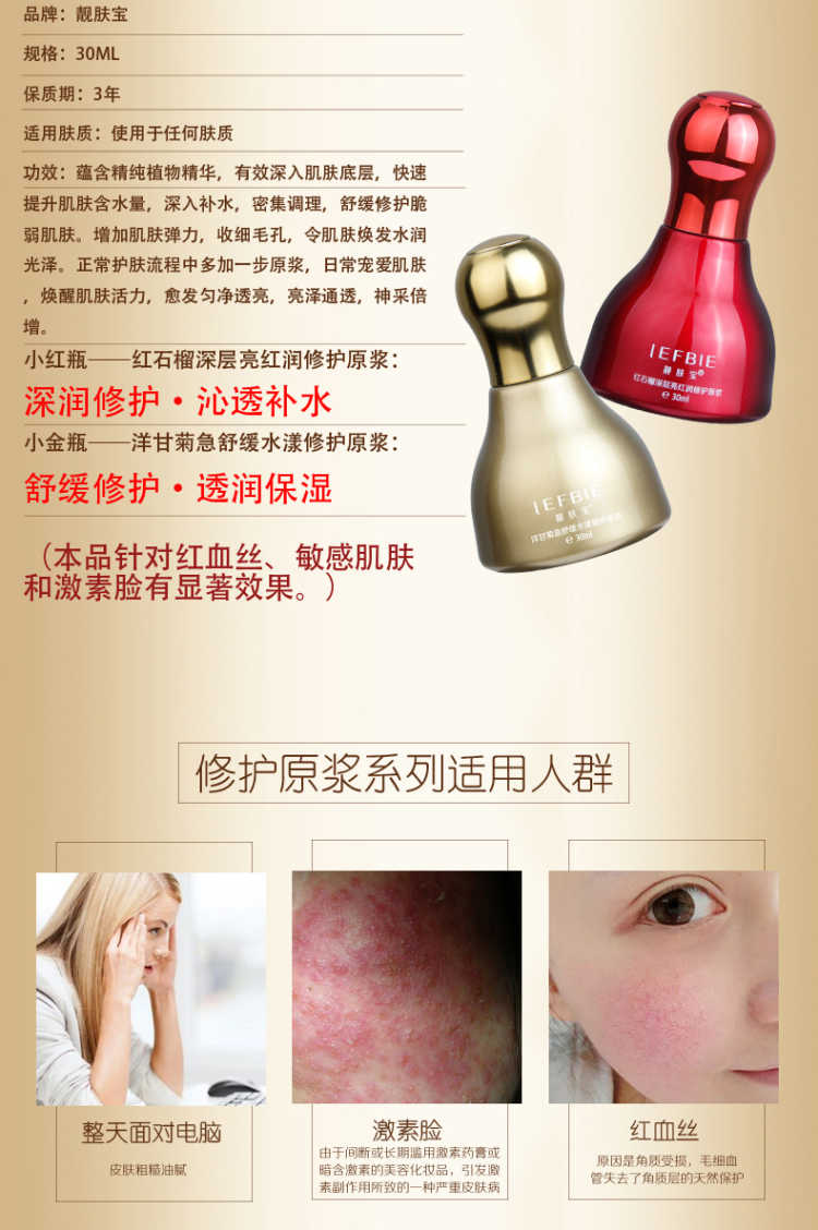 靓肤宝洋甘菊红石榴修复原浆蕴含高纯度植物精华,可增强皮脂膜与角质细胞的防御力,改善毛细血管微循环,恢复纤维组织状态,修复破裂受损的的毛细血管,增强血管壁弹性与韧性,具镇静、抗敏、舒缓及补湿技能,性质十分温和。同时具有保湿、安抚、去皱纹、抗敏功能,不反弹、不复发,全面修复及改善红血丝、赤红面现象。