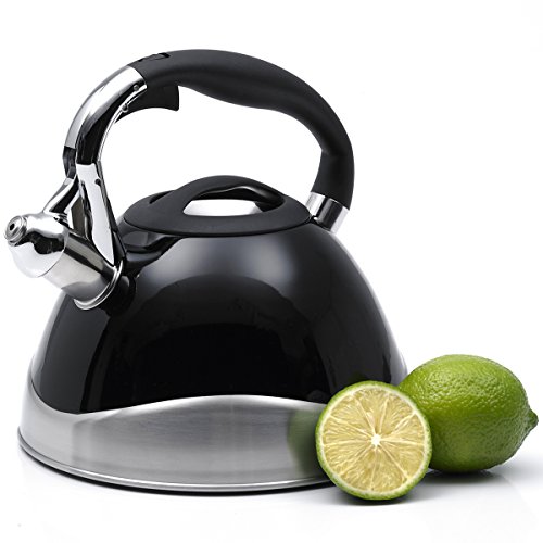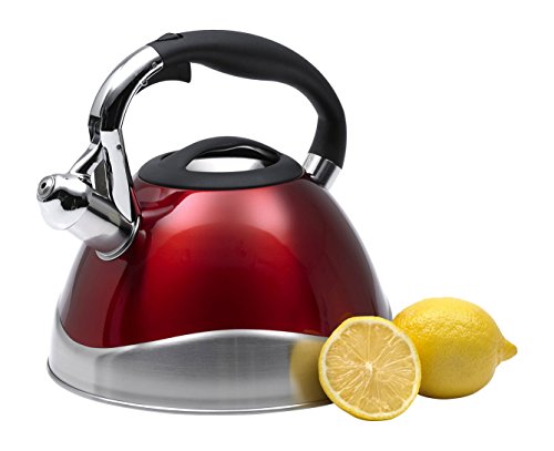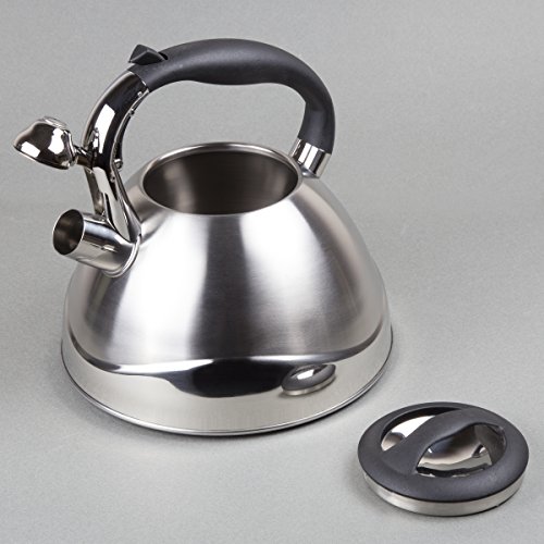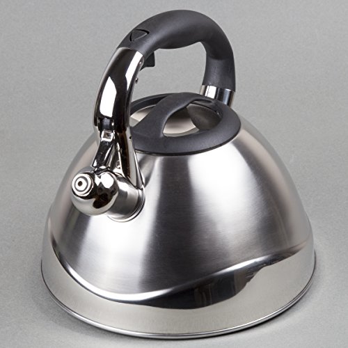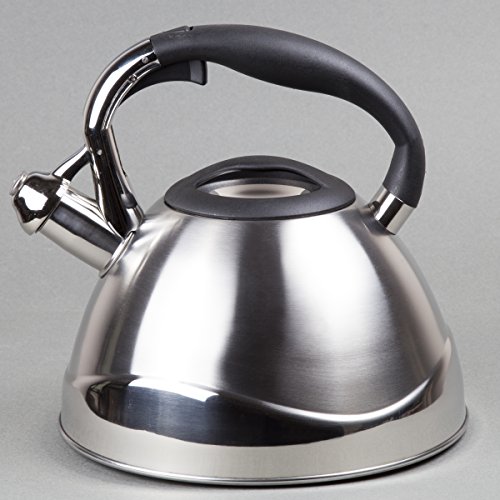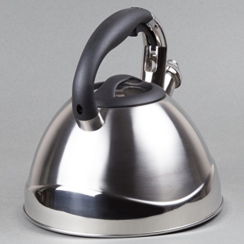 Crescendo 3.1 quart stainless steel whistling tea kettle with an aluminum capsulated bottom for even heat distribution and ergonomic stay cool handle.