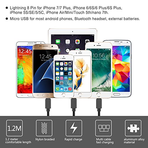 2 x Lightning 8-pins connector for iPhone 7/7 Plus, iPhone 6/6S/6 Plus/6S Plus, iPhone 5S/5/5C, iPhone Air/Mini/Touch 5th/nano 7th; 1 x Micro USB connector charge for most android phones, Bluetooth headset, external batteries.