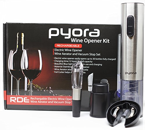 BEST WINE GIFT - ELECTRIC WINE OPENER - WINE STOPPER, WINE AERATOR, FOIL CUTTER all included and backed by a 1 Year Warranty - PYORA branded products are built with reliability, dependability and durability and are covered by a 1 year warranty against defects in materials or workmanship. We have thousands of happy customers and a 4.9 / 5 Seller Feedback Rating! Our customers say that we have a Customer Service like nothing you've seen on Amazon, because we aim for you to be happy!