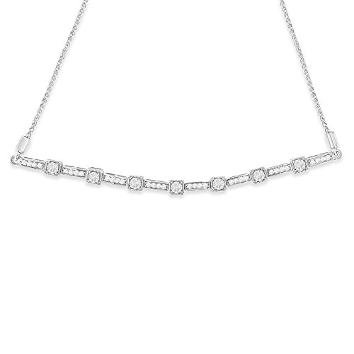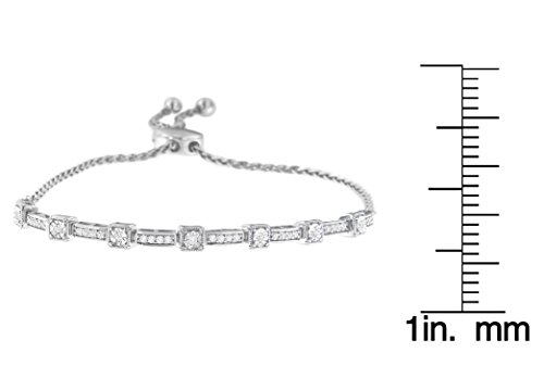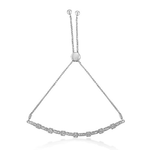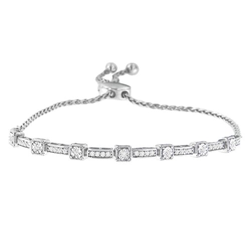 Express your affection to her with this dazzling bolo bracelet. Uniquely designed, it is composed of sleek sterling silver, which is finely polished with grace. The bracelet features round, and rectangular accents that are adorned with flickering round cut diamonds. It comes with an adjustable chic wheat chain and bolo clasp that lends a custom fit.