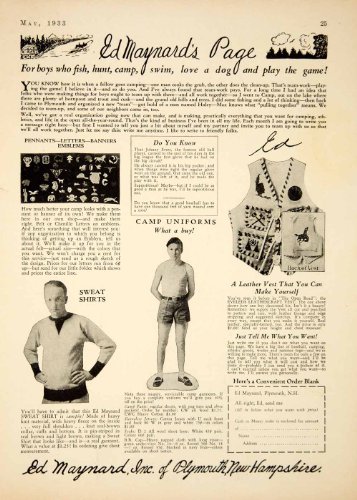 -. Brand : PeriodPaper LLC-Collectible Original Print Archive -. Feature : Product Type: Original Print Ad; Black / White / Grade: Very Fine ++ / Dimensions: Approximately 8 x 11.25 inches; 20 x 29 cm / Authentication: Serial-Numbered Certificate of Authenticity w/ Full Provenance / Packaged in custom sleeve w/ archival black board (great for display, gift-giving, and preservation) -. Genre : History -. IsAdultProduct : 0 -. IsAutographed : 0 -. Label : Authenticated -. Manufacturer : Authenticated -. PackageQuantity : 1 -. ProductGroup : Entertainment Memorabilia -. ProductTypeName : ENTERTAINMENT_MEMORABILIA -. Publisher : Authenticated -. Studio : Authenticated -. Title : 1933 Ad Ed Maynard's Page Leather Vest Uniforms Sweatshirt Clothing Boys Pennant - Original Print Ad