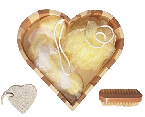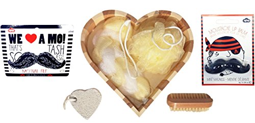 Includes decorative wooden heart-shaped box, one long mesh sponge for your back & one round mesh sponge for lathering up, 2 sided wooden nail brush, mustache shaped nail file & lip balm and heart-shaped pumice.